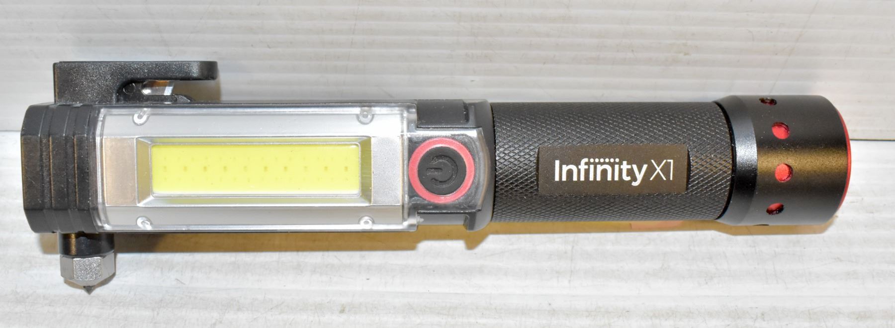 USES AA BATTERIES. ALSO HAS SEATBELT CUTTER, MAGNET & WINDOW BREAKER