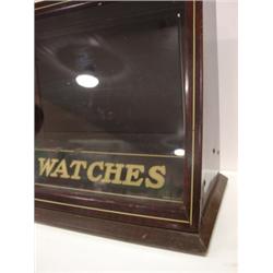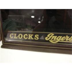INGERSOLL TIN COUNTER TOP STORE DISPLAY CASE. Labeled on front beneath glass "Clocks Ingersoll Watches". Two tin sliding doors in back. 10.5" H, 26" W, 7.25" D