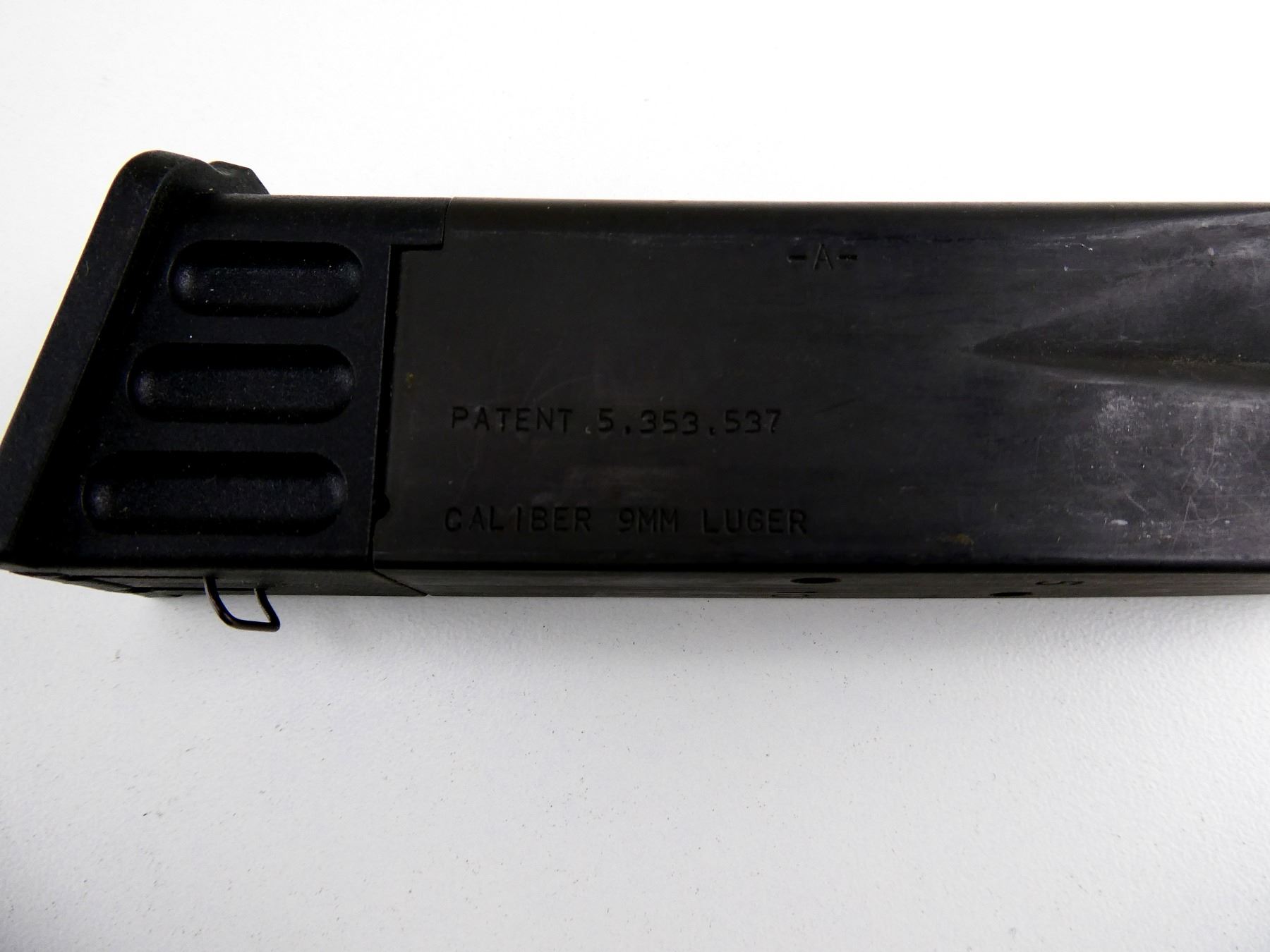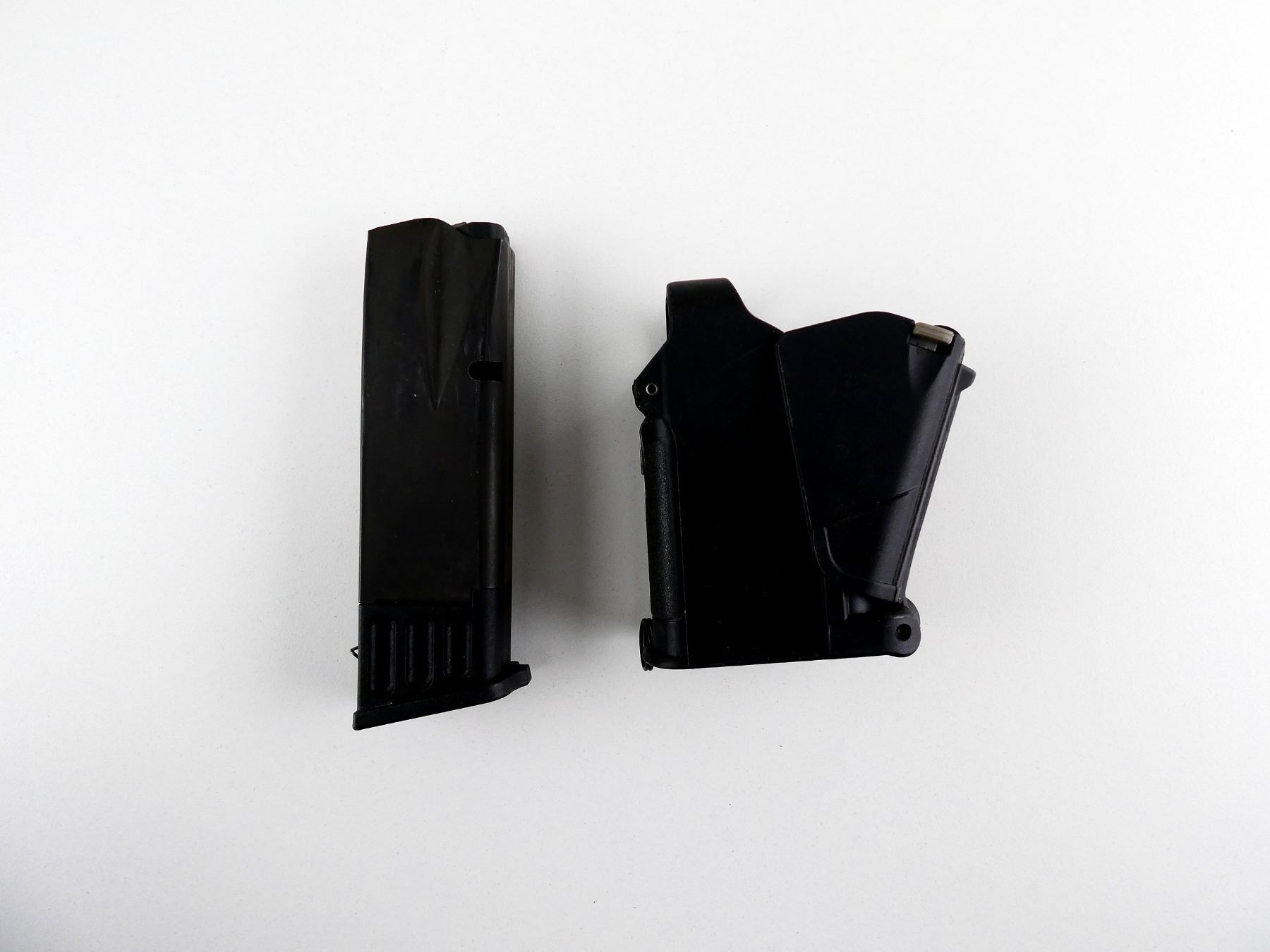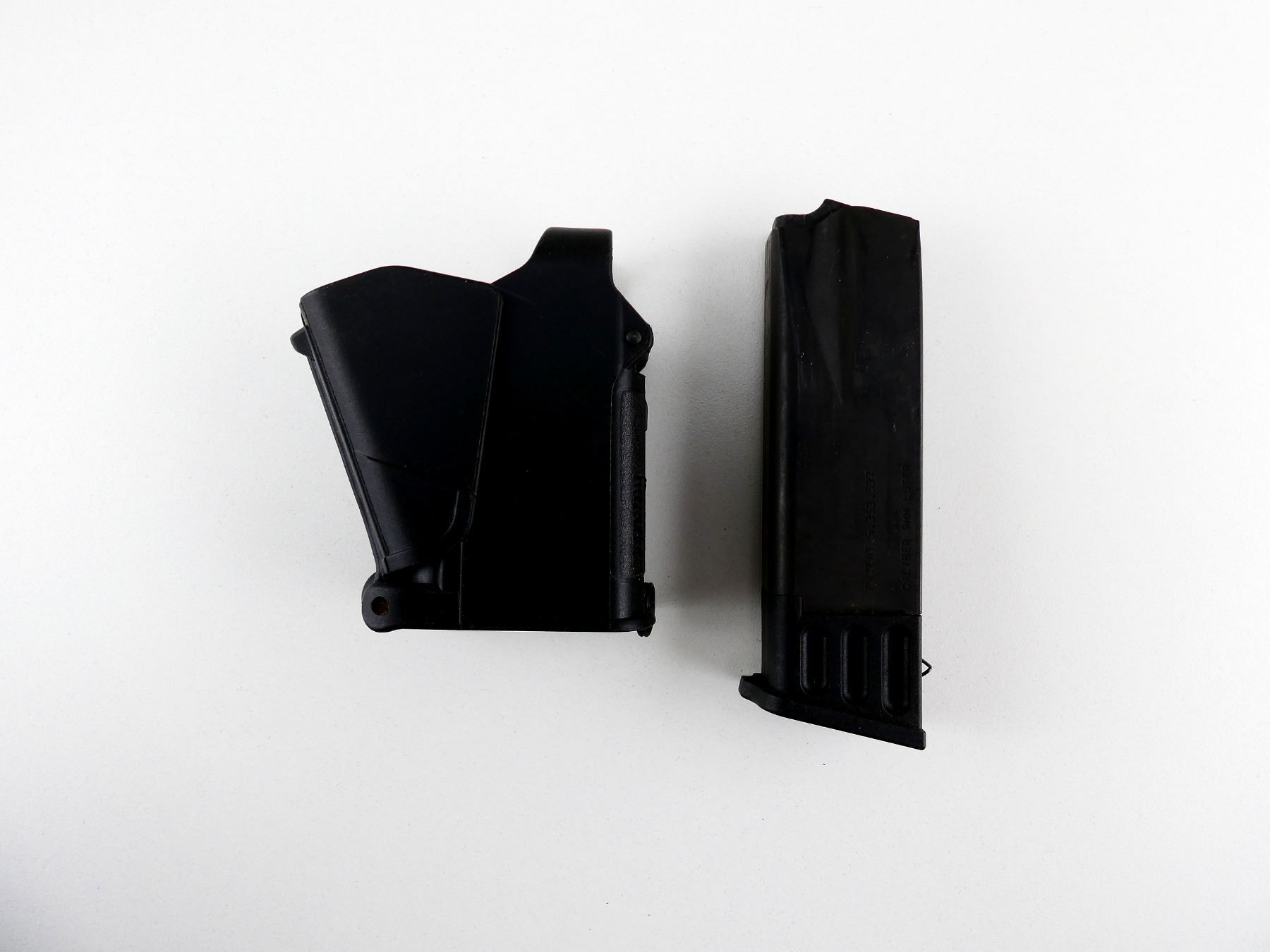 LOT INCLUDES; (1) 9MM MAG, 10 RNDS, METAL & POLYMER CONSTRUCTION, MARKED: "CALIBER 9MM LUGER", ETC. & (1) UPLULA 9MM TO .45 ACP MAG LOADER / UNLOADER, BLACK POLYMER, VARIOUS MARKINGS. SEE PHOTOS. PAL REQUIRED.