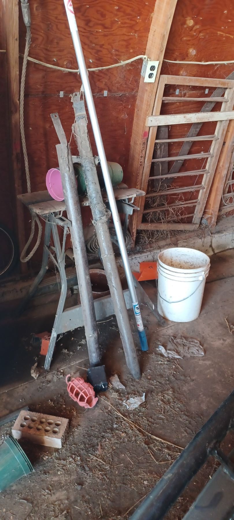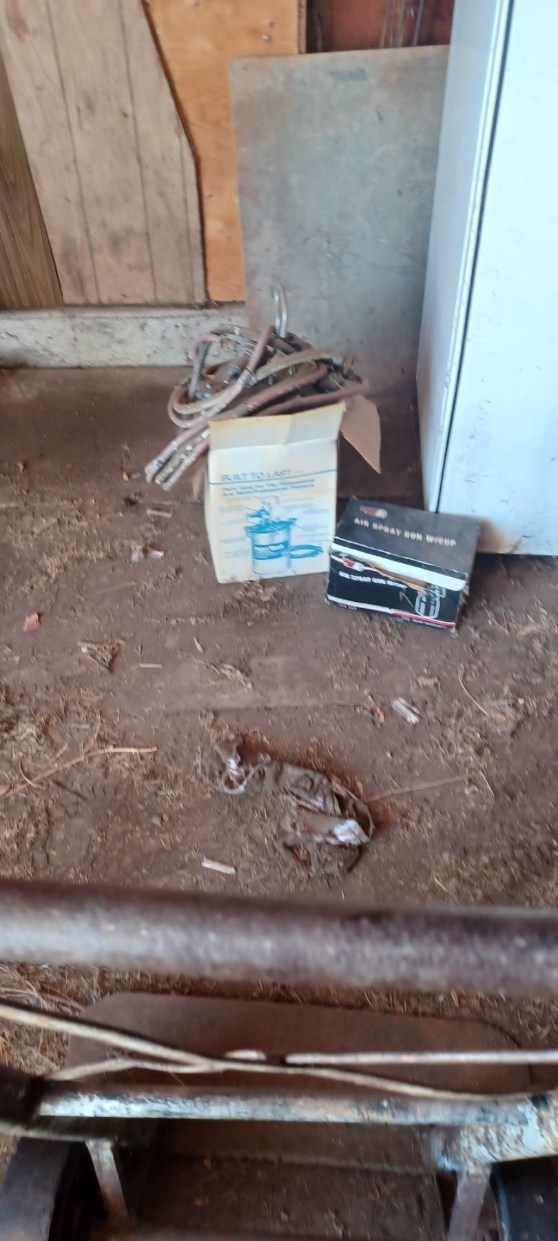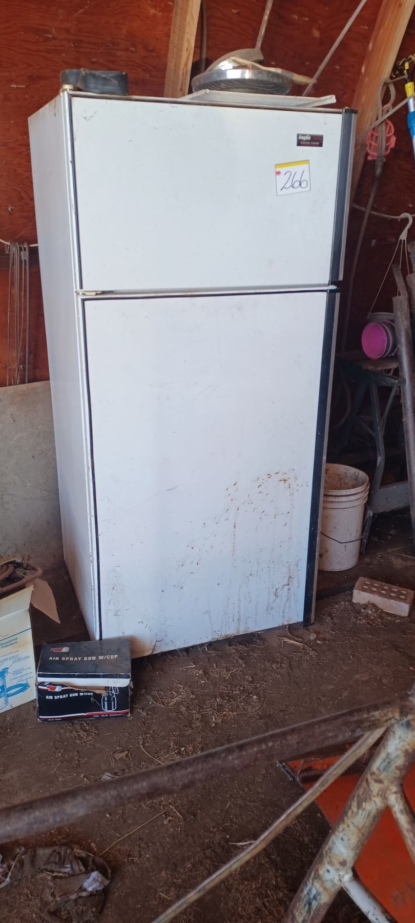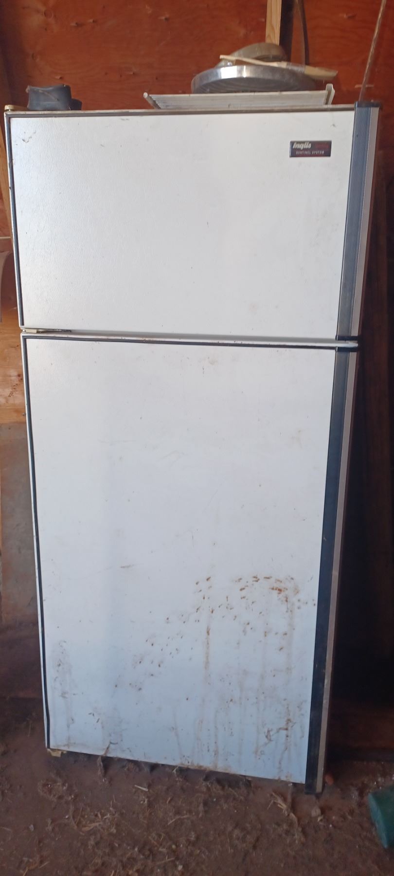 INGLIS STERLING FRIDGE (WAS USED AS STORAGE UNIT), PAINT TANK SPRAYER, SAW HORSE