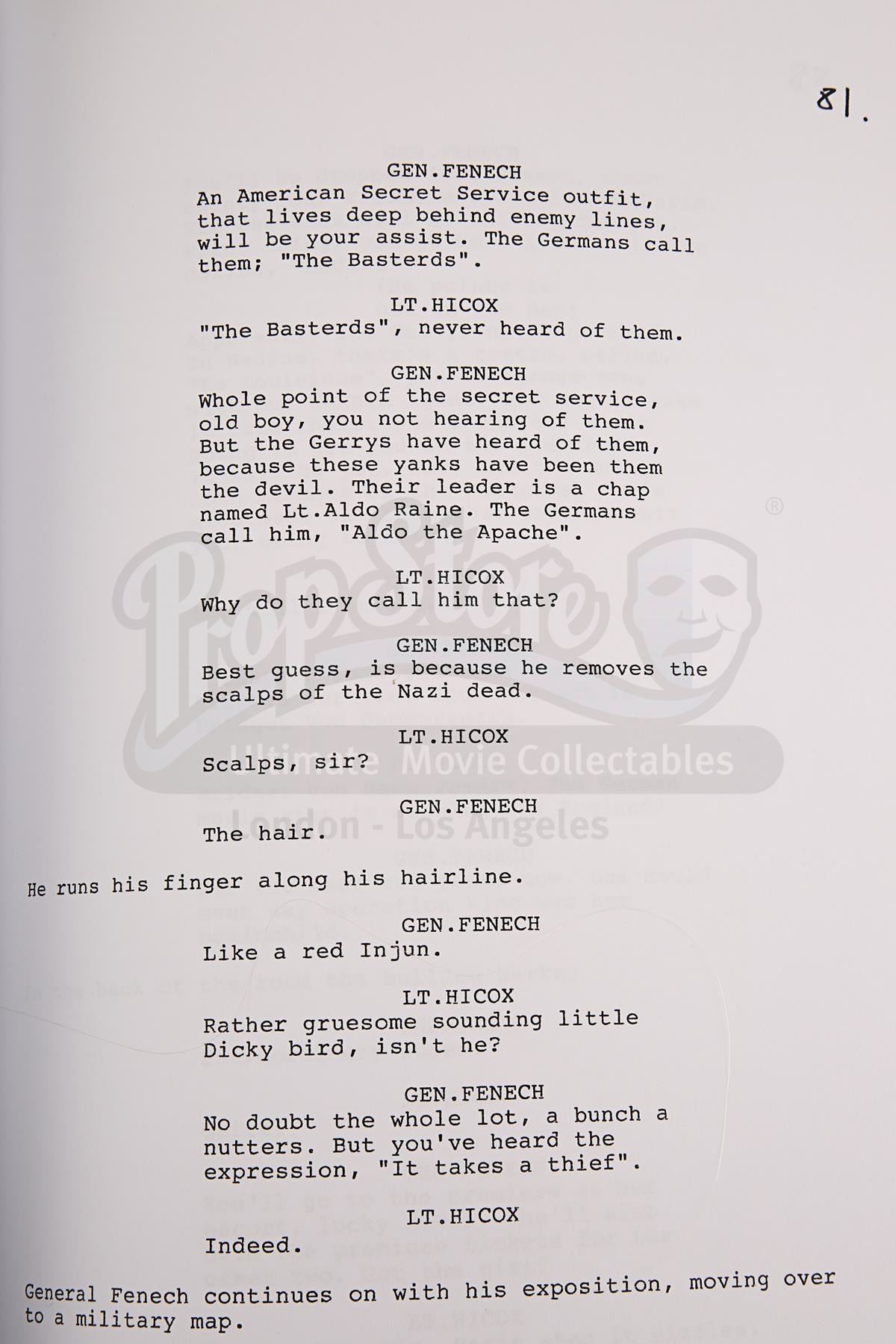 A premiere invitation card and script from Quentin Tarantino's black comedy war film Inglourious Basterds. Aldo Raine (Brad Pitt) found invitations in the purse of Bridget von Hammersmark (Diane Kruger) when he interrogated her and hatched a plan to infiltrate the Le Gamaar cinema.