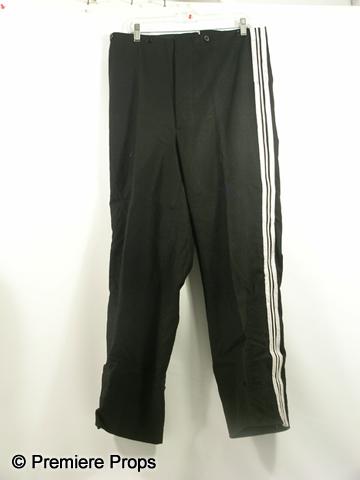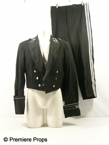 Inglourious Basterds (2009) - Nazi Usher's screen worn, hero, slightly dirty and bloody, black wool long sleeve six button with two different silver 'Nazi SS' patches on the neck, silver 'Das Reich' on the right sleeve, silver patch design on the shoulders, 'Siam Costumes' jacket, (no size) and black with silver and white shiny stripes down the side 'Siam Costumes' pants. (adjustable in the back)
