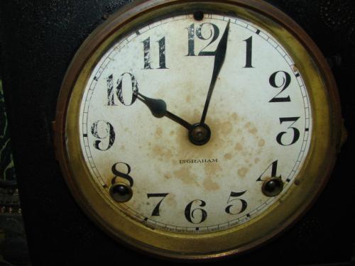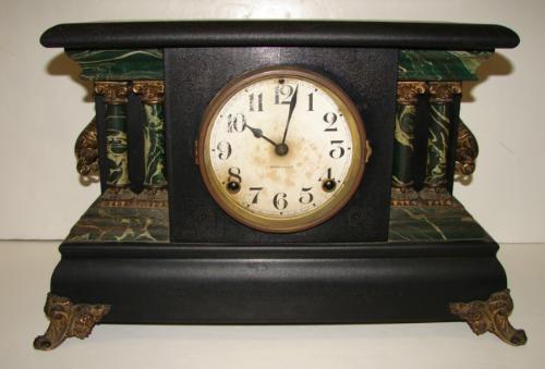 INGRAHAM EBONIZED MANTEL CLOCK. Clock has wooden faux marbled columns at sides with ornate brass handles and ornate brass feet. Clock face is marked “Ingraham” and clock retains original Ingraham label at reverse. Clock shows water damage at clock face