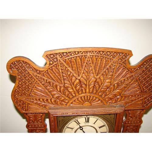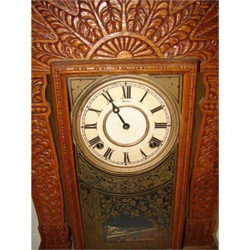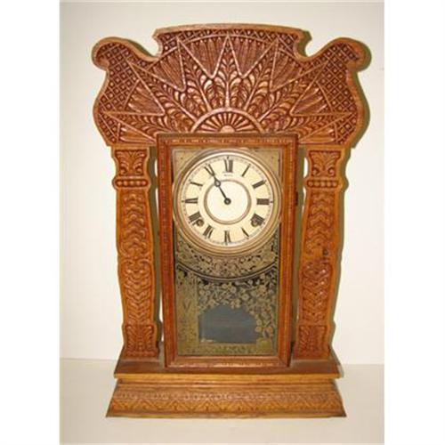 INGRAHAM OAK GINGERBREAD CLOCK. Has key and pendulum. Retains a small amount of paper label at reverse. 22.5" H