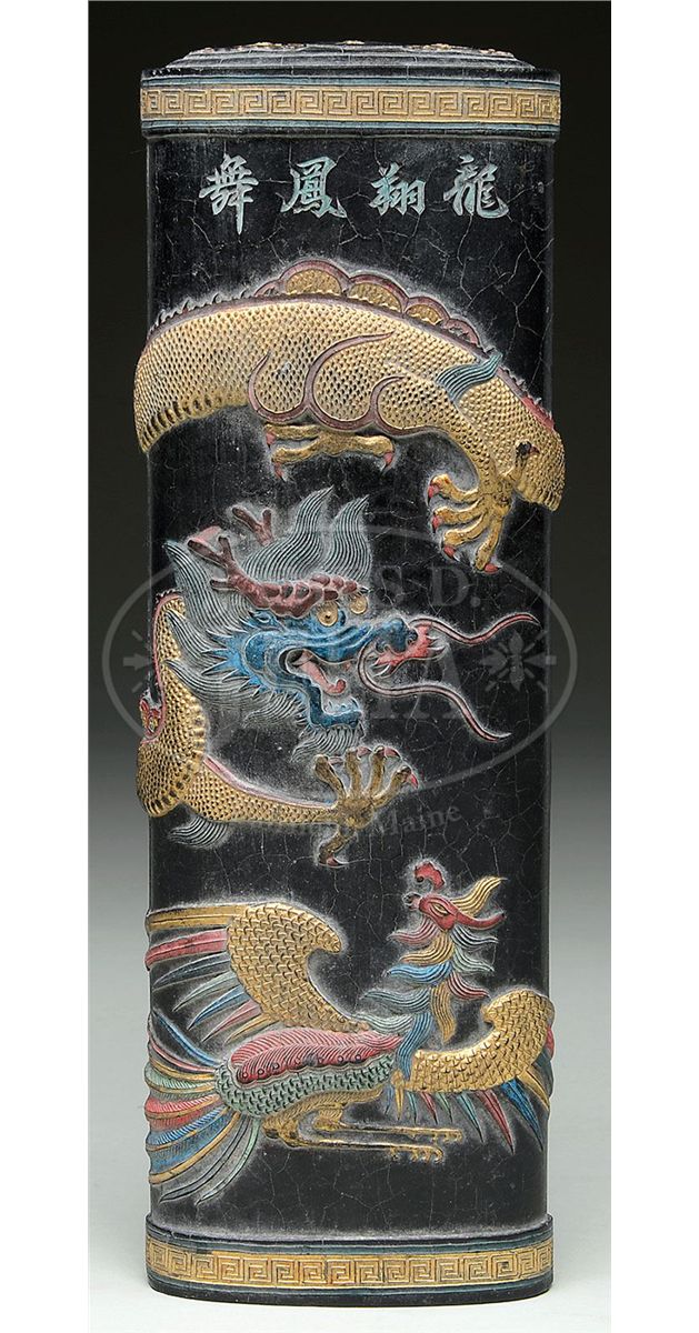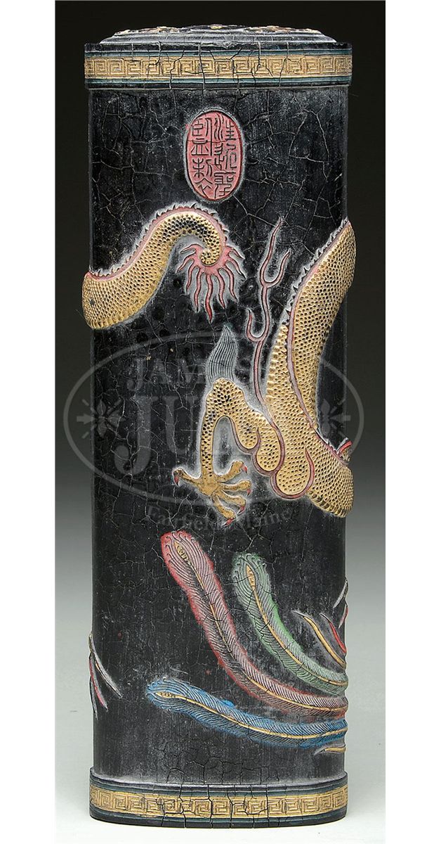 20th century, China. Pillow shaped with dragons in relief. Polychrome details. SIZE: 12" l X 4" w. CONDITION: Craquelure to surface. 7-74237