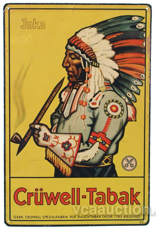 INKA Colorful Metal Sign "Cruwell-Tabak" Depicts Indian Chief w/ Peace Pipe - 9" x 14"
