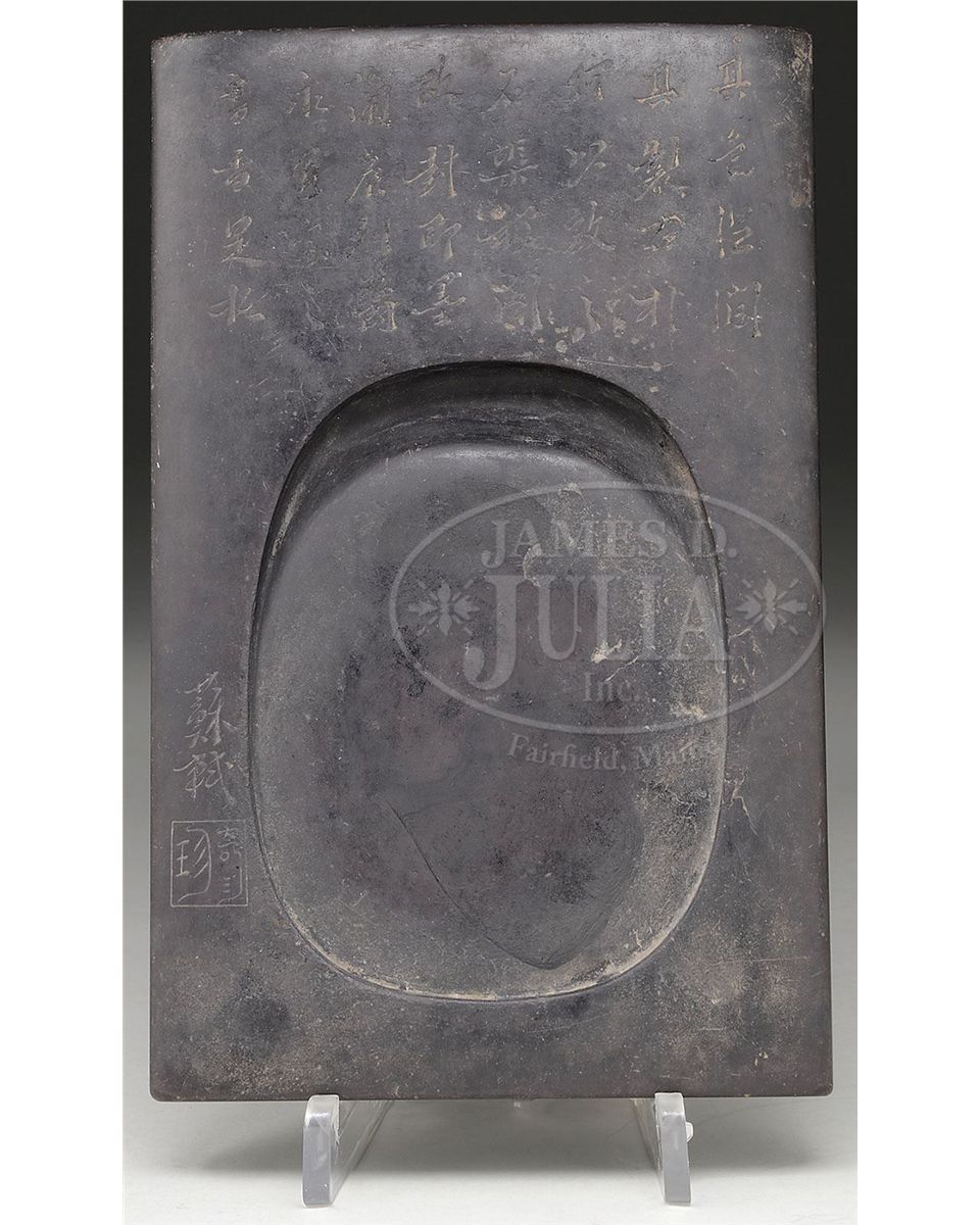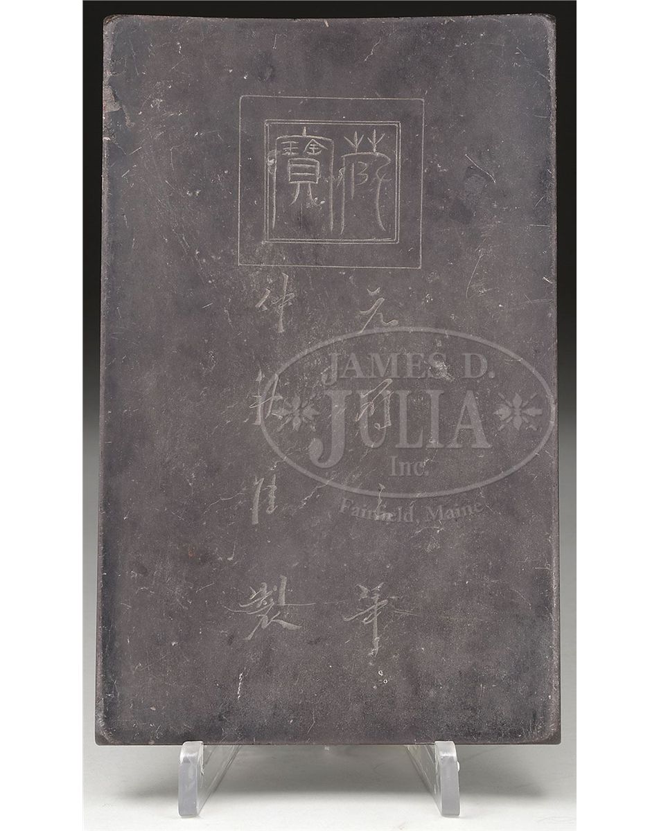 19th century, possibly earlier, China. Inkstone having one side decorated with a palm, the other with the maker's name, and shaped in the form of a rooftop. SIZE: 10" h x 6-3/4" w. PROVENANCE: From a private New York State collection. CONDITION: Generally very good with minor rough edges. 9-92623