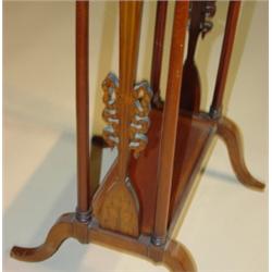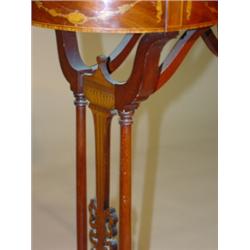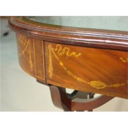 INLAID GLASS TOP SEWING STAND. Heavy ornate inlaid decoration around apron and on legs. 28.5" H, 22" W