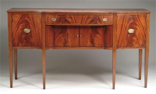 INLAID MAHOGANY CUSTOM HEPPLEWHITE STYLE SIDEBOARD. One central bowed drawer over two doors with a curved door on each side, one having inner cutlery drawer. Nice mahogany veneers with line inlay decoration. Decorative bale handled brasses. SIZE: 38in. h x top 68-1/4in. x 23in. d. CONDITION: Generally very good. 9-26376