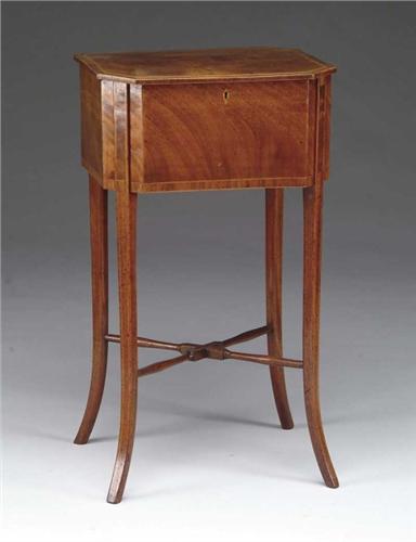 INLAID MAHOGANY LIFT TOP SEWING STAND. The cut corner top with light banded outside inlay lifts to reveal and open interior with two removable side compartments and deep open storage area. Four inlaid square outstretching legs with crossed block and turned stretcher. SIZE: 29-1/2” h x 16-1/2” w x 13-3/4” d. CONDITION: Good, some old repairs. 9-28012
