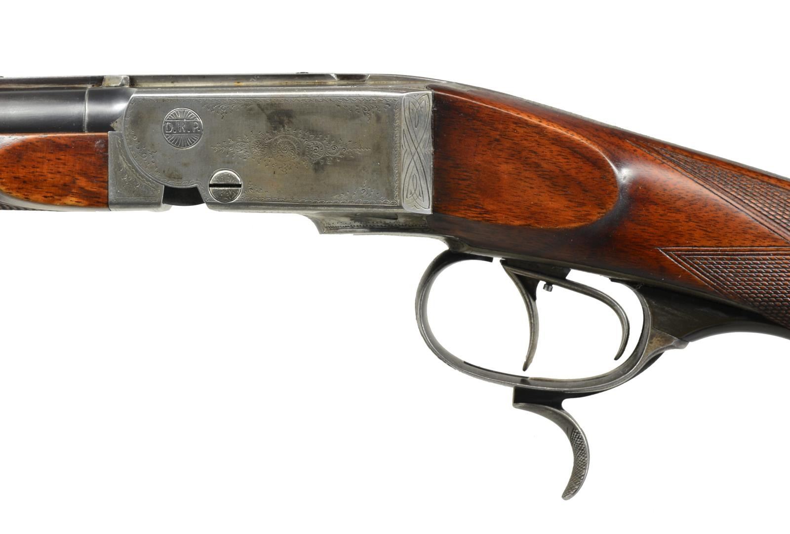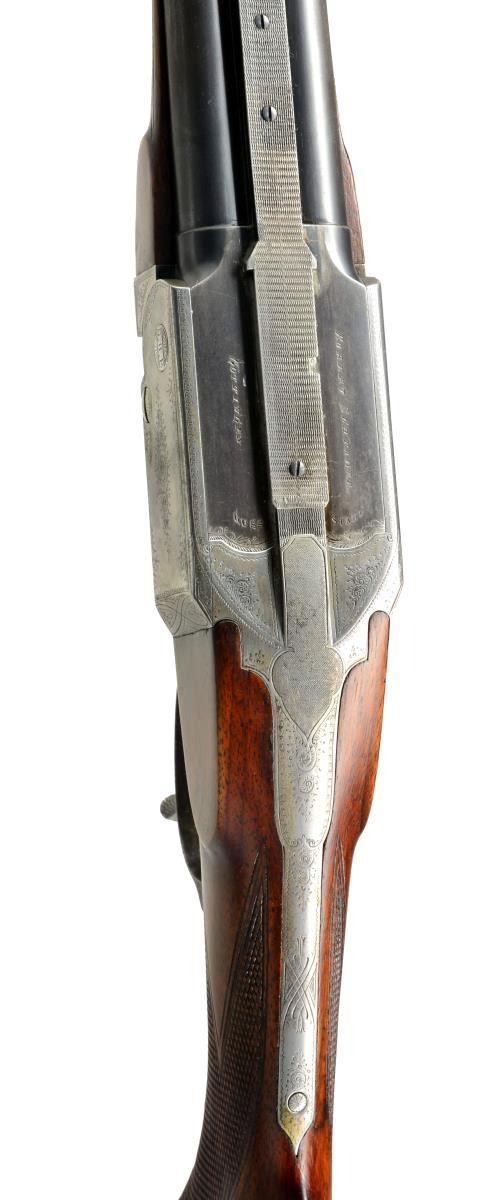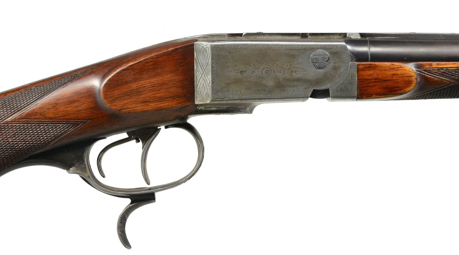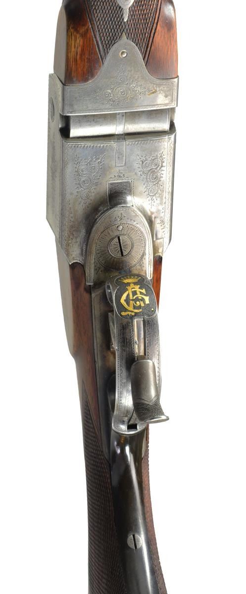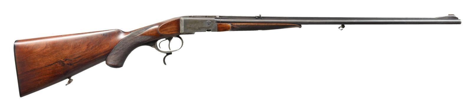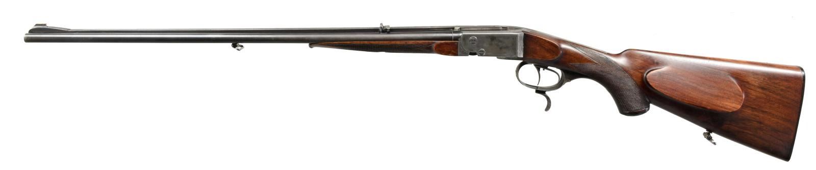 SCHRADER INCORPERATING HIS UNIQUE ACTION & SAFETY/COCKING SYSTEM, ONCE THE PROPERTY OF A COUNT. Cal. 9.3 x 74 R. S# 27255. Bbl. 25 5/8". Robert Schrader of Gottingen developed a number of patents for rifles, shotguns, & drillings that were quite popular at the turn of the 19 to 20th centuries. His most famous is incorporated in this rifle w/ a combined cocking/opening "trigger on outside of trigger guard bow. Pushing forward opens the rifle. In its center position, rifle is uncocked & completely safe." pulling the trigger to the rear cocks the rifle. To return to safe position, simply pushing the cocking trigger forward again uncocks action. His other patent used in this rifle is the unique breeching system using trunions on sides of bbls. which engage heavy sides of the breech area. Bbls. are locked down by a Purdey type sliding bolt. This action is obviously very strong & is quite slim in profile, but "a bit heavy" when viewed from top or bottom. Bbls. are removed by undoing lg. screw on left side of action which allows side plate to be rotated down & out of position & then removed. Further removal of extractor actuating arm allows bbl. set to be lifted out. 25 5/8" Bbls. of chopper lump construction are fitted w/ full length flat matted rib. A 1 standing 1 folding leaf U-notch rear sight is dovetailed through & a brass bead front is longitudinally dovetailed into slightly raised front ramp. Rear portion of rib is cut for slide on scope mounting system. Top of breech section of bbls. is engraved "Robert Schrader Gottingen". Rear portion is engraved "GUSS" "STAHL" in front of lunate extensions that fit into recesses in action, completing the extremely strong lock up of this rifle. Sides of breech section are stamped w/ pre WWI German nitro proofs for 9.3 x 74 R cartridge. Ends of trunions are engraved "D. R. P." Case hardened action features bushed strikers & double triggers (both set). Action & sideplates are engraved w/ sprays & scroll w/in scroll borders. Front portion of trigger guard is semi relief inlaid in gold w/ a monogram "A.G." surmounted by the crown of a count. Trigger guard extension is of horn & it extends to a horn grip cap. Lightly streaked & figured dense European walnut capped pistol grip buttstock measures 14 1/4" over ribbed horn buttplate & features sm. right hand cheekpiece, point pattern checkering w/ mullered borders at grip. A sling loop is on toeline, matching that on bbl. Matching splinter forend w/ schnabled tip has Deely release. MEASUREMENTS: DAH approx. 2 1/2". DAC approx. 1 1/2". Cast 3/8" off. WEIGHT: 7 lb. 12 oz. UNATTACHED ACCESSORIES: this rifle won the "most innovative design" award presented by the German Gun Collectors Association at the 2014 Vintagers World Championship shoot (plaque included). CONDITION: very good. Bbls. retaining most of what appears to be their original blue. Action w/ traces of original case hardening color is mostly silver to gray. Stocks retain nearly all of an old oil refinish w/ a few light subsequent marks. Checkering has been cleaned up. Bores are fine to very fine, mostly shiny w/ strong rifling throughout (slight erosion at the throats). Action is very tight. Bbls. are on face. Set triggers work. This relatively light rifle built in a fairly powerful cartridge handles very well. (20-2382/MGM31). CURIO. $6,000-10,000.