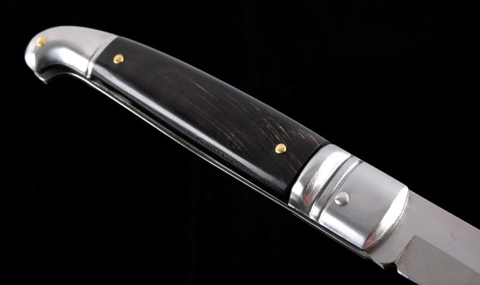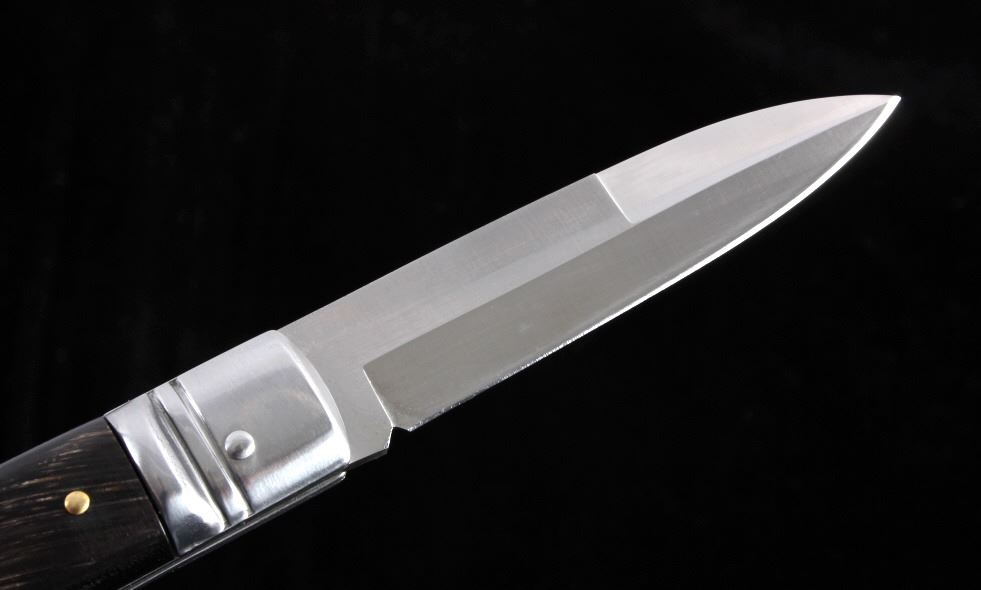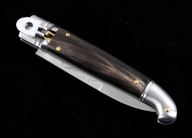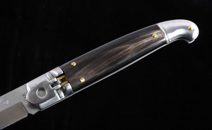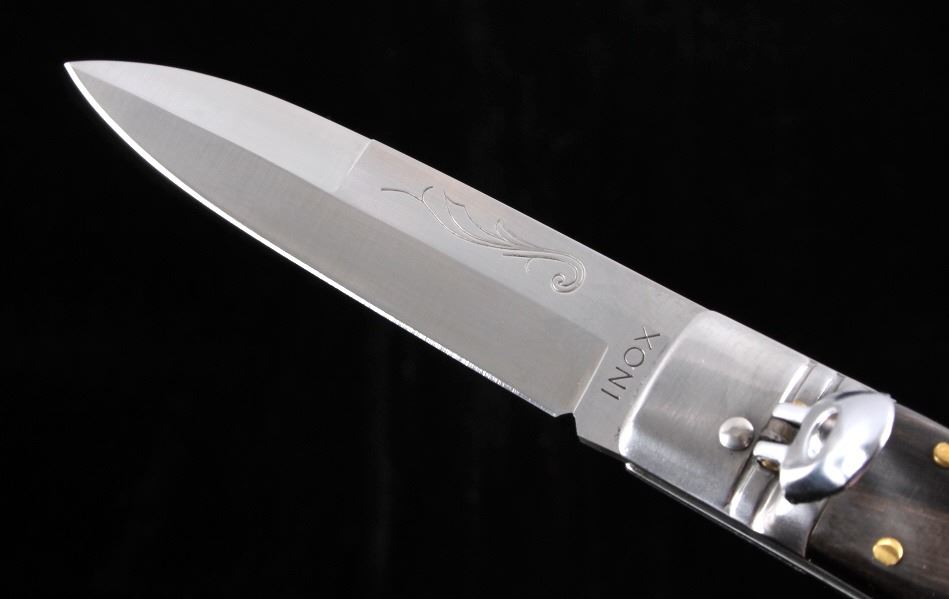This is an INOX German made lever lock switchblade knife. The knife features a genuine buffalo horn handle with a hardened steel bayonet style blade that is marked "INOX". The switchblade knife shows exceptional quality and craftsmanship and is in excellent condition. It measures 8" long with a 3" blade.