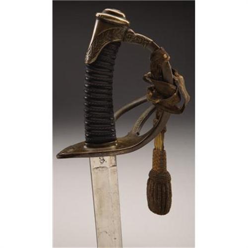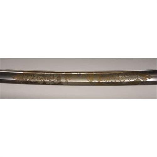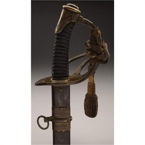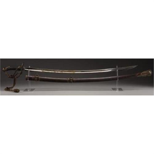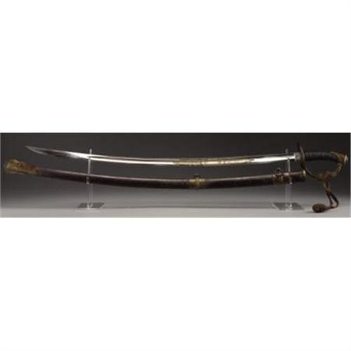<B>M1840 CAVALRY OFFICER’S SABER INSCRIBED TO BRIGADIER GENERAL J. HOWARD KITCHING MORTALLY WOUNDED AT THE BATTLE OF CEDAR CREEK.</B></I> With an unusual blade etch incorporating the new York State Seal. At the beginning of the Civil War John Howard Kitching enlisted as a private in the Lincoln Cavalry. Shortly thereafter he was commissioned a captain in the 2d New York Artillery and participated in all the battles of the Peninsula campaign. In September 1862 he was commissioned Lieutenant Colonel of the 135th New York Infantry which on October 3, 1862 was designated the 6th New York Heavy Artillery, which he ascended to command of in April of 1863. Subsequently Kitching was almost constantly in command of a brigade and was finally brevetted brigadier general of volunteers on 1 August 1864. Kitching then took command of a provisional brigade in the Army of the Shenandoah and was mortally wounded at the head of his brigade at cedar creek, October 19, 1864. He died on January 11, 1865 in Dobb’s Ferry New York, as a result of those wounds. He was 25 years old. The sword is in wonderful untouched condition. The brass hilt is decorated with floral and scroll motifs at the base of the base of the branches of the guard, at the point where the knuckle bow joins the pommel, in the face of the pommel cap and on the quillon. The leather grip is wrapped with triple strand brass wire. It retains the original bullion sword knot and leather washer. The inscription, “J. Howard Kitching” is executed on the top of the inboard side of the counter guard. The 33” blade by Kirschbaum of Solingen exhibits a very unusual and beautifully executed blade etch. The obverse has a 10” panel with a gold washed Damascus background, displaying scroll motifs on the ends and a spread wing eagle with riband and motto in the center. The reverse uses an identical panel but the central theme is the seal of the State of New York with “Excelsior” riband. Very unusual and rarely encountered. All etching is highlighted with profuse hand engraved details. The steel scabbard has a brass throat and brass mounts with scalloped edges, chaised with floral motifs. The grag is notched and scalloped. A very nice cavalry officer’s saber exhibiting a rare and unusual blade etch inscribed to a gallant young ‘fighting’ general with a superb history.<BR><BR><B>CONDITION:</B></I> All brass with dark untouched patina. The leather grip and wire wrap are perfect. Bullion knot intact and excellent. Steel scabbard with light pitting on the obverse, retaining some of the original lacquer brown finish on the reverse. The blade is gorgeous retaining 95% of the original bright mint luster and the gold wash on the Damascus textured panels.<BR><BR><b>Shipping:</b> Requires 3rd Party Shipping (<a target="_blank" href="http://www.heritageauctions.com/common/shipping.php">view shipping information</a>)