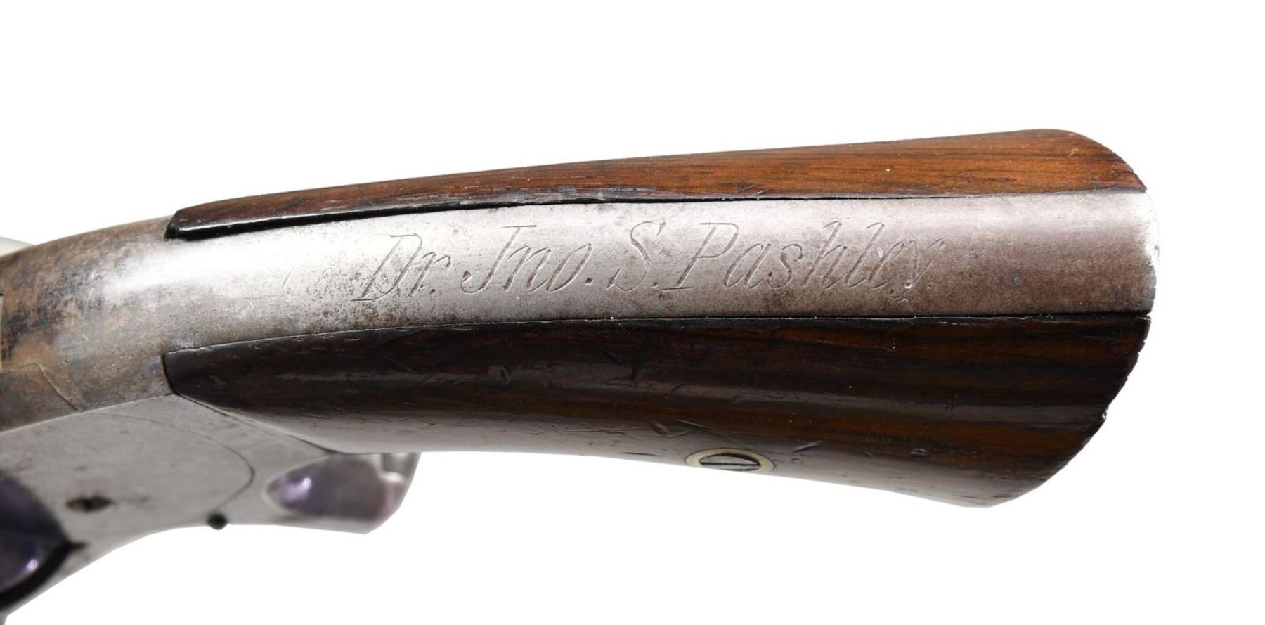 SURGEON JOHN PASHLEY 51th ILLINOIS INFANTRY. Cal. 32, S# 1744. Standard configuration up Smith & Wesson No. 2 Army revolver manufactured in 1861, 6" barrel, varnished walnut grips, finely inscribed on backstrap: "DR. JNO. PASHLEY". Jonathan S. Pashley (1830-1876) born in England, enlisted in Kentucky on June 17, 1861 as 1st sergeant, Co. B, 19th Ill Inf. He became hospital steward August 1861, Asst. Surgeon November 1861. Assistant Surgeon Pasley writes a letter August 12th, 1862 to the commander of the 10th Michigan Infantry "By order of Brig. Gen. Morgan, I was detailed to assist Surgeon Sparling of your regiment. Instead of being his assistant, I am his patient and totally unfit for duty. Continuously on duty for 14 months with but ten days relief, I am worn out and and pressed for leave of absence or resignation…". Pashley practiced medicine in Belle Plaine, Minnesota till his death at age 46, in 1876. UNATTACHED ACCESSORIES: file of research, and service records. CONDITION: revolver is very good to fine overall, matching serial numbers and assembly marks, crisp markings, 20-30% thinning blue finish, 70% original varnish to grips, mechanically fine, good rifled bore. PROVENANCE: Jimmy Wrenn, 1995; from the Lifelong collection of Robert "Mike" Bricker. (01-24971/JS). ANTIQUE. $2,000-3,000.