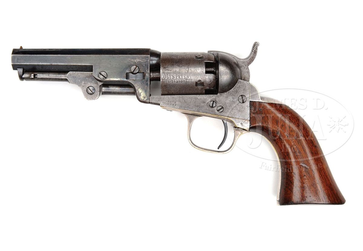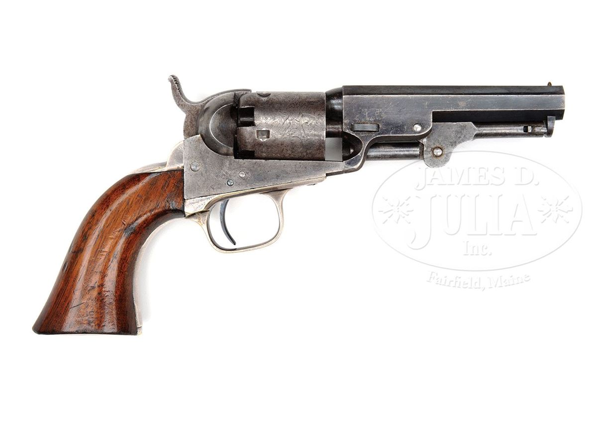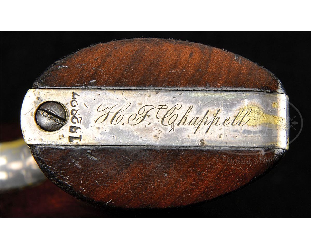 SN 182327. Cal. 31. Blue & color case hardened with 4" oct bbl, brass pin front sight & 2-line Hartford address. Left side of frame has a small "COLTS PATENT". The silver-plated brass trigger guard & backstrap contain an unnumbered, varnished, 1-pc walnut grip. Cylinder is 5 shots with stagecoach hold up scene roll marking & 4 of the 5 safety pins serviceable. Buttstrap is period script engraved "H. F. Chappell". Hiram F. Chappell of New London, CT enlisted in Union Army at age 27 as a 2nd Lt on May 7, 1861 & was commissioned into Company E, CT 2nd Infantry, where they were engaged in the first Battle of Bull Run, Feb. 21, 1861. He was mustered out on Aug 7, 1861 & commissioned into Company D, CT 12th Infantry on Jan 1, 1862 and was transferred out on Nov 26, 1864 into Company D, 12th CT Infantry and mustered out on Aug 12, 1865. He was promoted to 1st Lt on Oct 14, 1861 & to Capt on Apr 19, 1863. He was born on Sept 21, 1833, survived the war & died Oct 5, 1915. Capt Chappell's 12th CT was engaged in the Louisiana area from Oct 1862, participating in several battles there, most notably the Siege of Port Hudson, Louisiana May 25-July 9, 1863. In 1864, they were in the Shenandoah in the battles of Winchester Sept 19, 1864, Fishers Hill Sept 22, 1864 & the very costly battle of Cedar Creek Oct 19, 1864 where they suffered heavy casualties. Cedar Creek was their last battle. They participated in the Grand Review in 1865 and were mustered out in Aug 1865. This revolver was listed as item #1833 in a Flayderman catalog. Accompanying this revolver are numerous reprints of histories of the 2nd & 12th CT along with reprints of muster roles for Capt Chappell dating from 1861-1863 and numerous pages of pension applications and supporting documentation. PROVENANCE: Norm Flayderman, Marlan Polhemus Collection. CONDITION: Fine, all matching except wedge & grip which are unnumbered. Bbl retains about 85% thinning orig blue & the rammer dark case colors. Frame & hammer retain smoky case colors, lightly cleaned. Trigger guard & backstrap retain most of their orig silver plate with light wear on front strap. Grip is sound with lightly worn edges & retains most of its orig varnish. Mechanics are fine, bright shiny bore with a few spots of pitting. Cylinder is gray metal patina and shows 60-70% stagecoach holdup scene. 4-48745 JR83