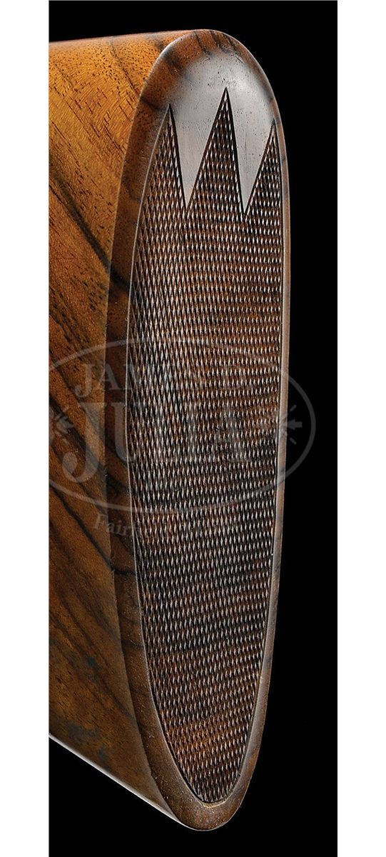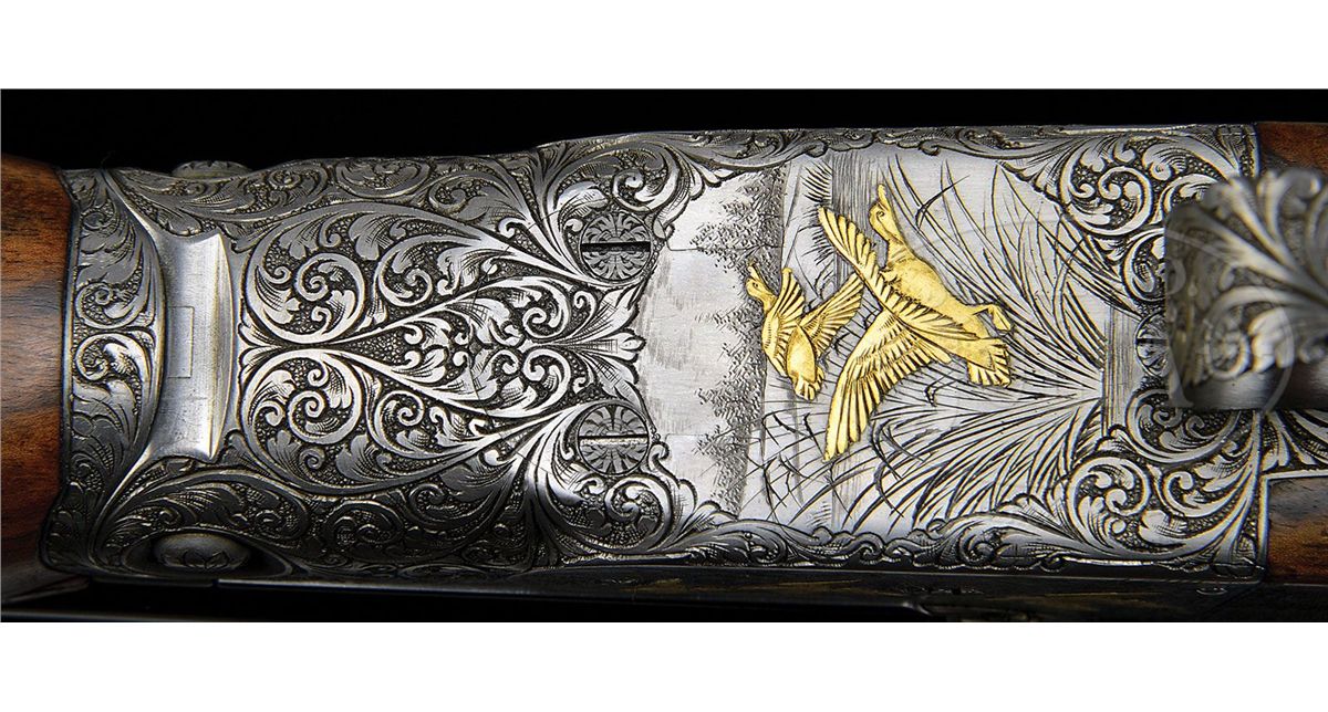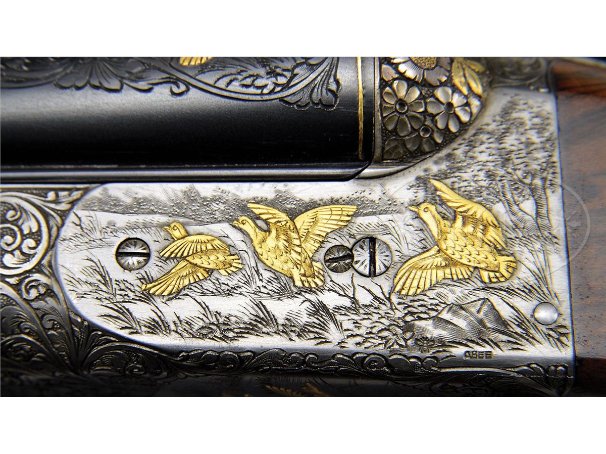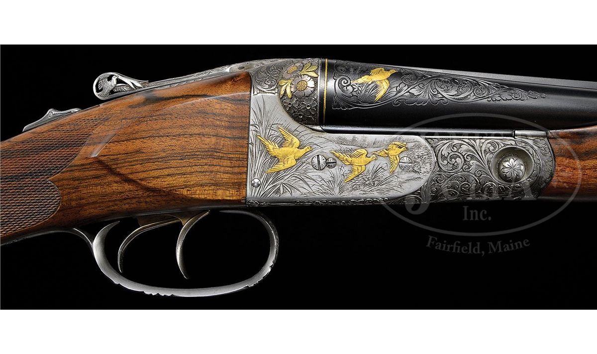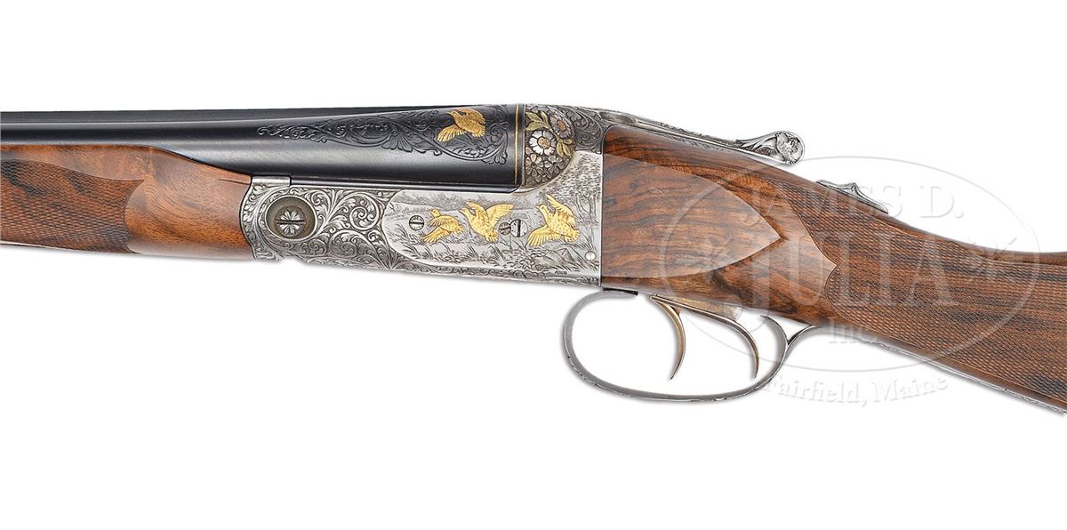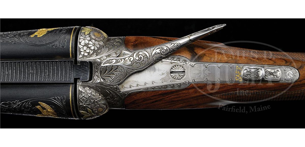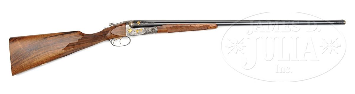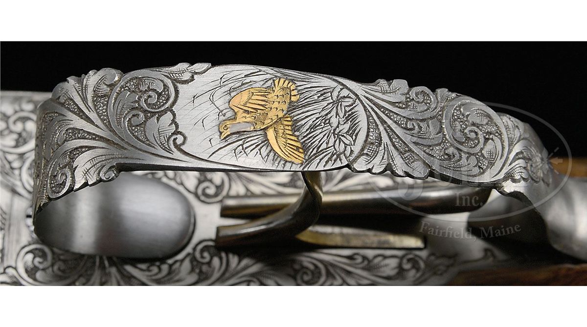 SN 151542. Cal. 28 ga. 2-1/2" Chambers. 0 Frame. 28" Bbls retain original markings on rib and bbl flats. Breech ends are engraved with 3" triangles of large, attenuated, shaded, scrolled acanthus with relief gold inlays of quail on left, and dove on right side. There are gold bands around breech ends as well as muzzles, that also have about 1" of scroll. Coin finished action with non automatic safety (SAFE inlaid in gold) and double triggers, is engraved with large, open, shaded, scrolled acanthus surrounding relief gold inlaid game birds in appropriate backgrounds; a trio of quail flush from scrub land on left side of action, and a trio of doves swoop over meadow on right, two mallards explode from marsh in circular vignette on trigger plate, and a bobwhite flushes from reeds on trigger guard bow which has had its outer edge filed following shape of engraving. Top lever has relief carved return and is pierced, filed and engraved leaving full bodied quail. Fences are full relief engraved in floral motif accented by relief gold foliage and details of flowers. This fine engraving is by Angelo Bee whose signature appears on left bottom rear of action. Nicely streaked European walnut buttstock with lovely fanned fiddle figure, measures 14-3/4" over point pattern checkered wood butt. Borderless checkering at grip is in unusual flame pattern. A vacant gold oval is on toe line. Small beavertail forend has checkering in harmony with that on grip. Bore diameter: left-.566, right -.566. Bore restrictions: left -.020 (Full), right -.017 (Mod). Wall thickness: left -.022, right -.032. Drop at heel: 2-1/8", drop at comb: 1-5/16". Weight: 6 lbs. 10 oz. LOP: 14-3/4". CONDITION: Excellent, as custom finished. Bbls retain essentially all of their fine satin blue. Coin finish of action shows some slight darkening, giving excellent definition to engraving. Rubbed oil finish of stocks is excellent, with a few minor marks. Checkering is very slightly darkened. Bores are excellent. Action is tight. Bbls are on face. 4-49578 MGM115