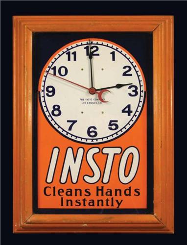 INSTO Hand Cleaner Porcelain Clock in a Wood Frame. Excellent Condition, Works. 16 1/2 x 22 1/2 inches.
