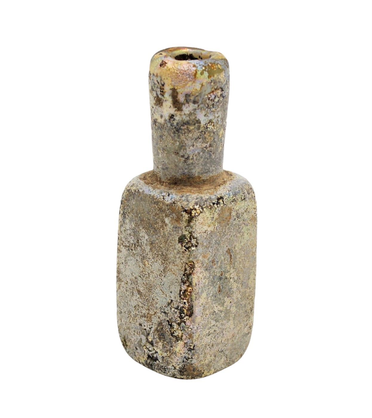 INTACT ANCIENT ISLAMIC ABBASID GLASS BOTTLE 9TH-10TH CENTURY.made of clear glass, the faceted and slightly flared neck leading to a square body with gently sloping shoulders, with flat base