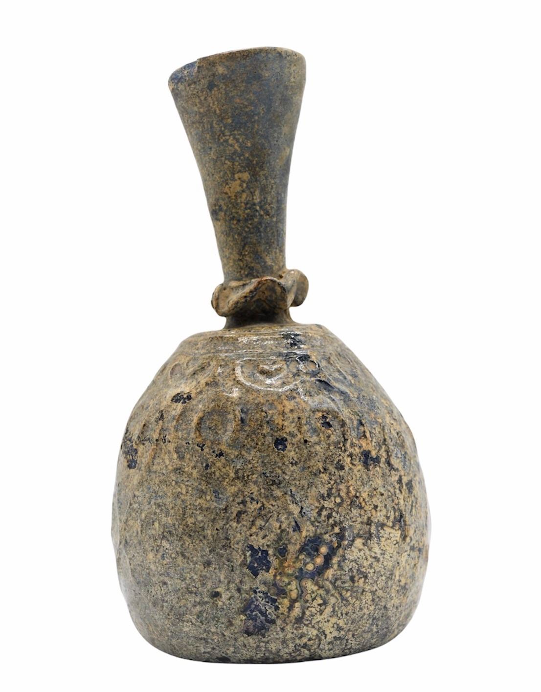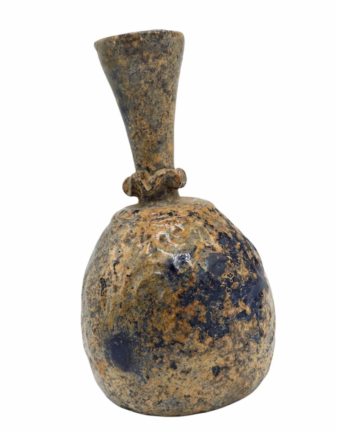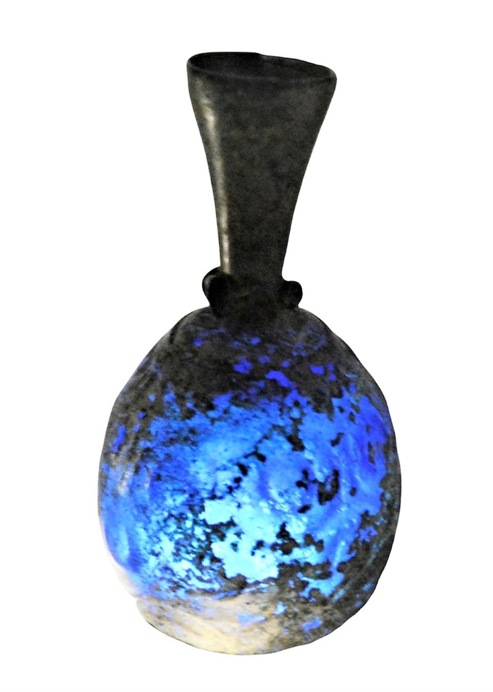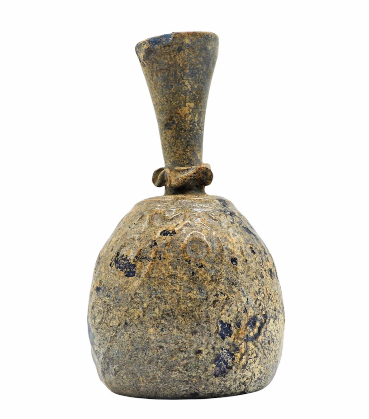 A RARE INTACT ANCIENT ISLAMIC DARK BLUE MOULDED GLASS BOTTLE, PROBABLY ABBASID OR SAMANID CIRCA 11TH-12TH CENTURY, Blue in color, mold-blown, the globular body decorated with a honeycomb lattice, the long tapering neck with an applied glass of decoration to the neck.