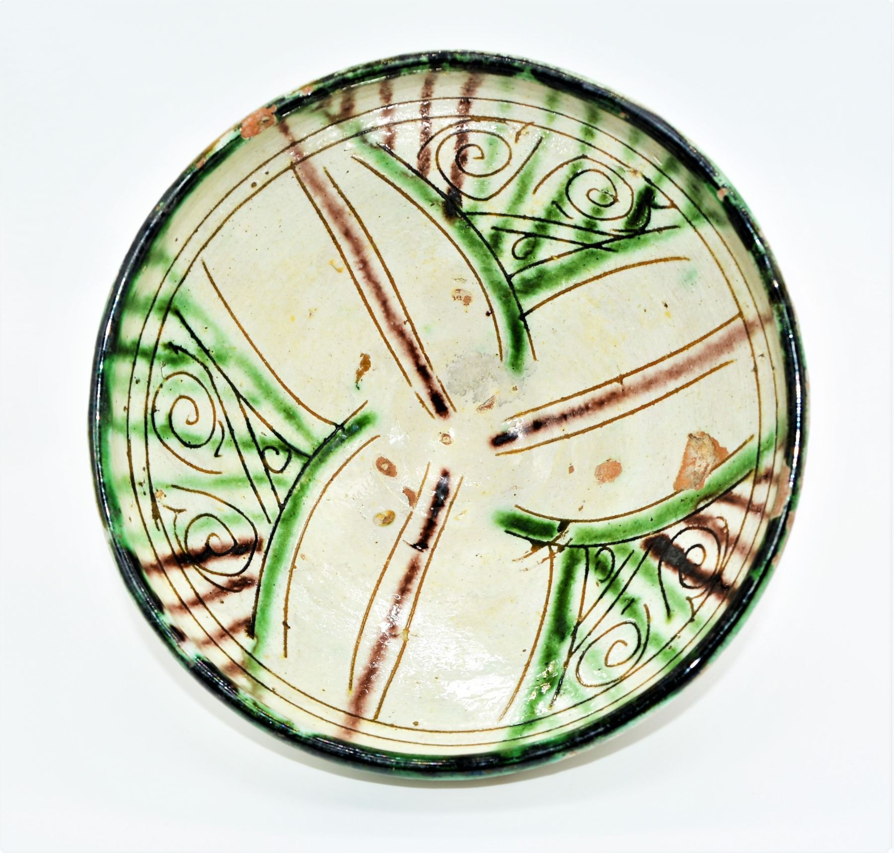 Earthenware bowl with incised decoration in a white slip and painted in green.