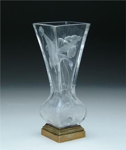 INTAGLIO CUT CRYSTAL VASE. Exceptionally fine crystal vase has intaglio cut duck coming in for a landing with flowers, buds and leaves extending around the bottom of the vase. Vase is housed in a brass two-tiered foot. Signed on the underside "Escalier de Cristal Paris". SIZE: 9-1/2 in. t. CONDITION: Very good to excellent. 5-61088