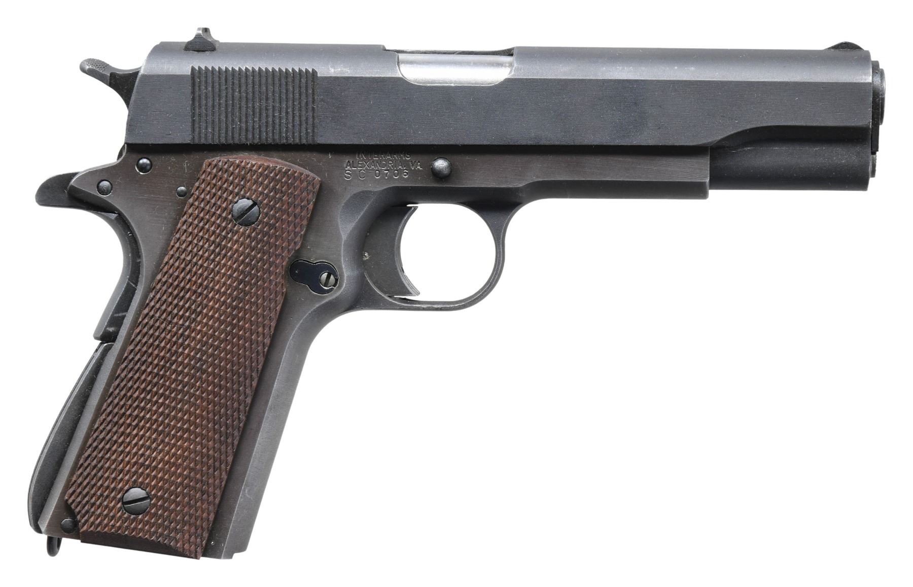 AUTO PISTOL. Cal. 45 ACP. S# SC0706. This pistol was produced by Interarms in Alexandria, VA by contracting for 1911A1 frames & assembled using GI surplus parts. This one has Remington Rand parts including High Standard 5" barrel & Remington Rand slide. Fully checkered walnut grips. MAGS: NONE. CONDITION: very good overall appearance showing light handling wear. Bore shows very good rifling. (25-3116/MD). MODERN. $400-600.
