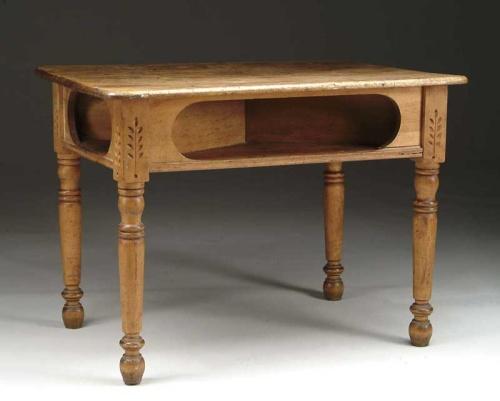 INTERESTING ANTIQUE COUNTRY GAME TABLE. The rounded corner multi-board top supported by a frieze having four oval front compartments. All resting on four turned legs which have chip carved tree decoration. PROVENANCE: From a fine Hallowell, Maine mansion. SIZE: 29" h x 27-1/4" d x 39-1/2" w. CONDITION: Good, shows some use with scrub top. 9-26876