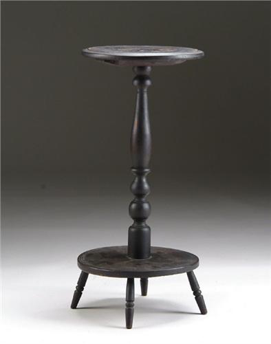 INTERESTING ANTIQUE WINDSOR STYLE CANDLESTAND. The round top with molded edge and single bottom cleat. Central turned shaft screws into top and bottom. The bottom with a round base having three incised circles at edge supported by four nicely turned short splay legs. What appears to be its original dark finish. Bottom of stand has old writing ""Property of Marie E. Jones, Yuma, AZ Left in care of my cousin Mrs. Allen 1917 "". Rare form in desirable condition makes this a very attractive stand. SIZE: 27-1/2in. h x 12-1/2in. dia. CONDITION: Very good. Some finish loss to top. 9-26134