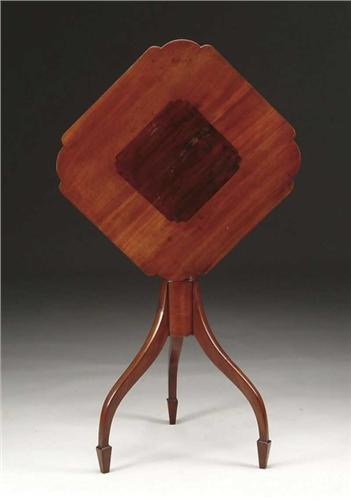 INTERESTING CHERRY FEDERAL CANDLESTAND. Shaped corner square top has light and dark finish. The tilt top tilts at angle supported by a turned and cylinder post supported by four tall out sweeping spider legs with spade feet. PROVENANCE: Weber Estate, Hallowell, Maine. SIZE: 29-1/4” h x top 20” x 19-1/4”. CONDITION: Minor finish loss to top, otherwise very good. 9-27025