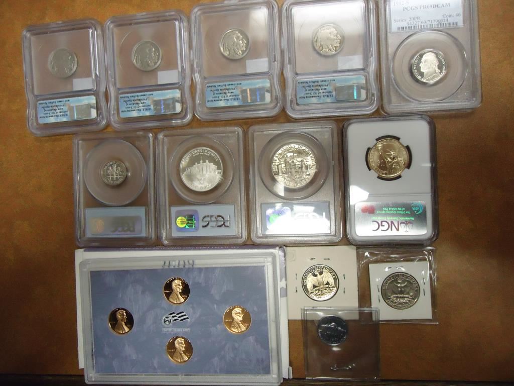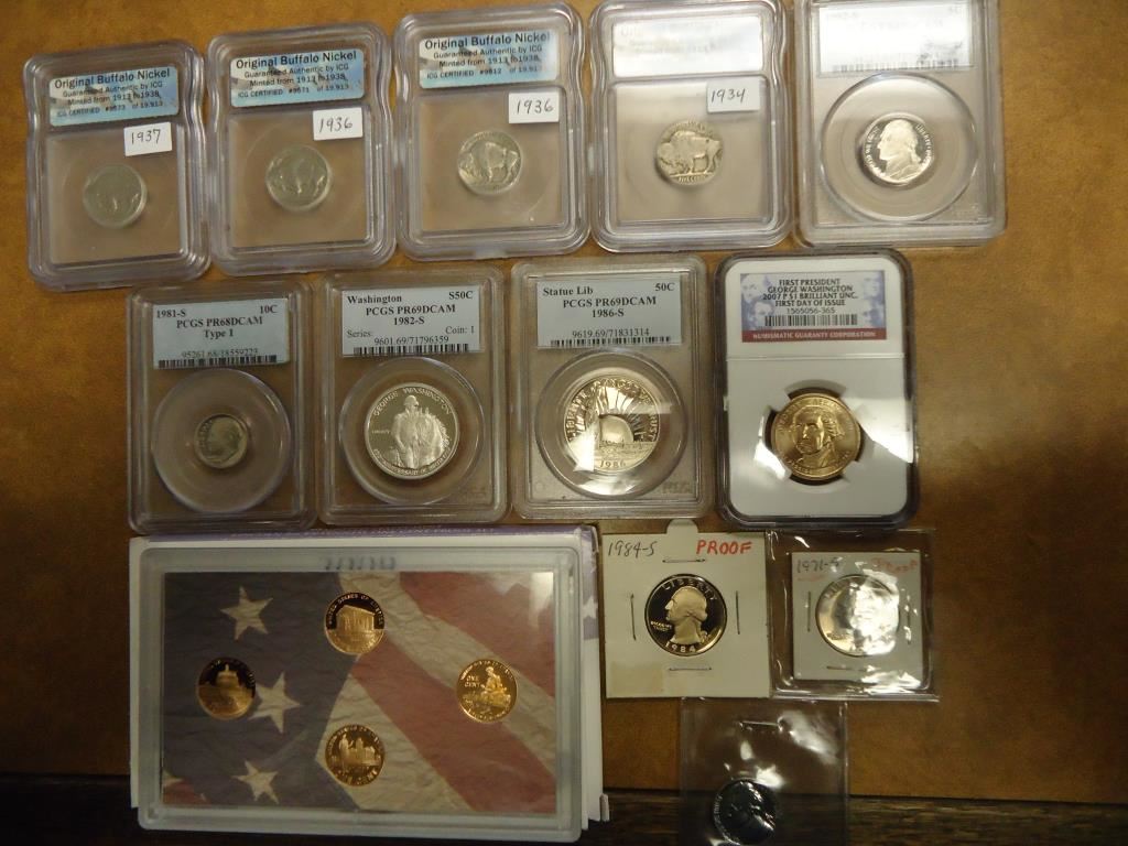 CERTIFIED COINS: 1934, 1936, 1936 & 1937 BUFFALO NICKELS ALL ICG, 1992-S JEFFERSON NICKEL PCGS PR69 DCAM, 1981-S TYPE 1 ROOSEVELT DIME PCGS PR68 DCAM, 1982-S WASHINGTON COMMEMORATIVE HALF PCGS PR69