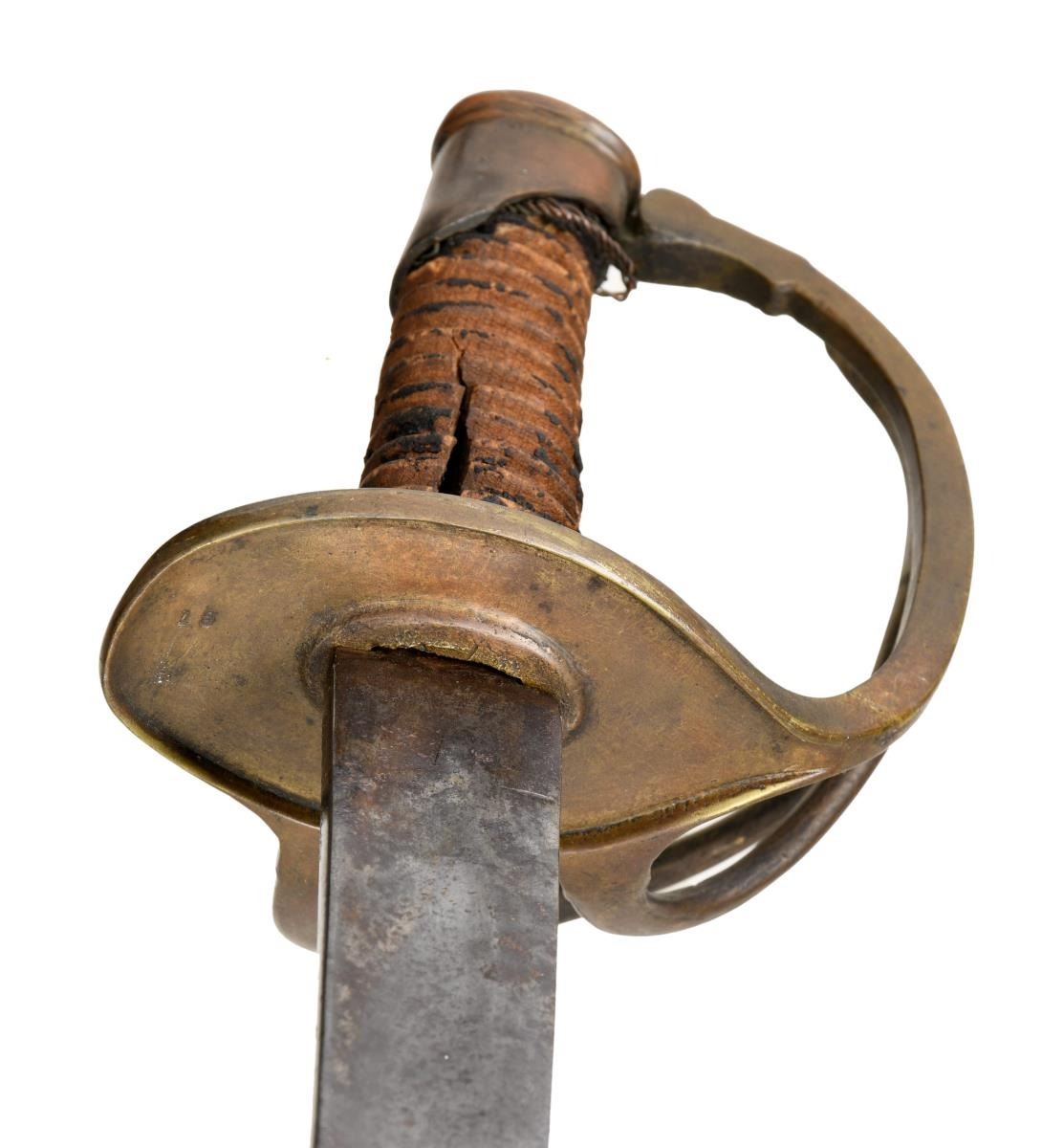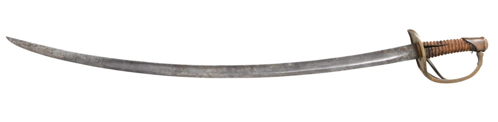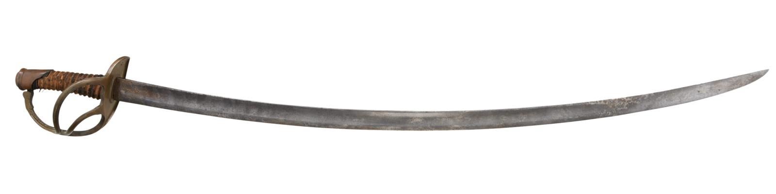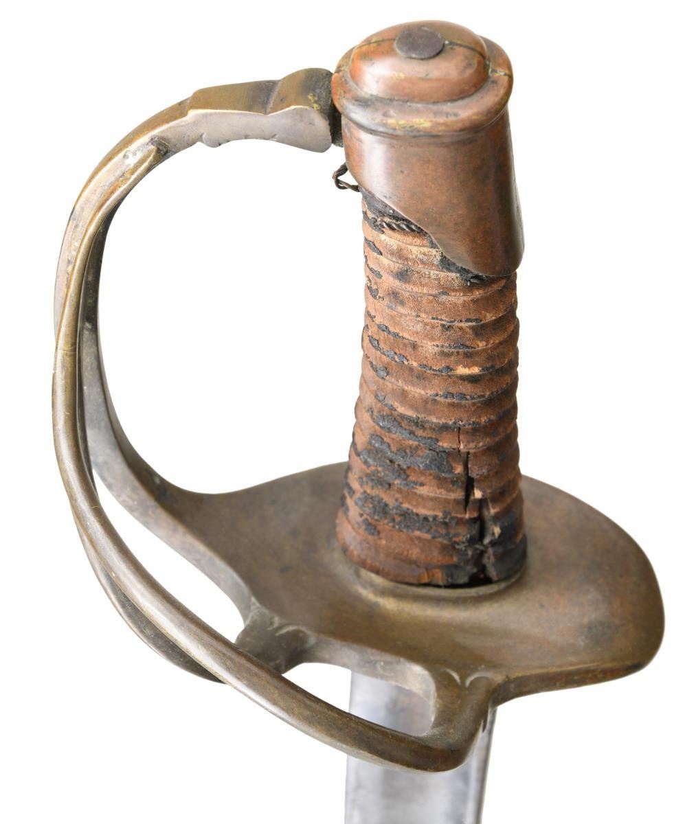 35" unstopped fuller blade with forging flaws, well-made heavy brass hilt with cast figural serpent's head at terminus of knucklebow entering cast 2-piece pommel. There is braised 2-piece construction of branched hilt rarely seen outside New Orleans made swords & sabers. Bottom of guard numbered "15" and cast decoration at branches interface with guard. CONDITION: sword appears "as found" with rich brass patina, blade gray with areas of pitting. Spiral carved grip is weathered missing most of its leather and twisted wire wrap. (02-19153/JS). $1,500-2,000.