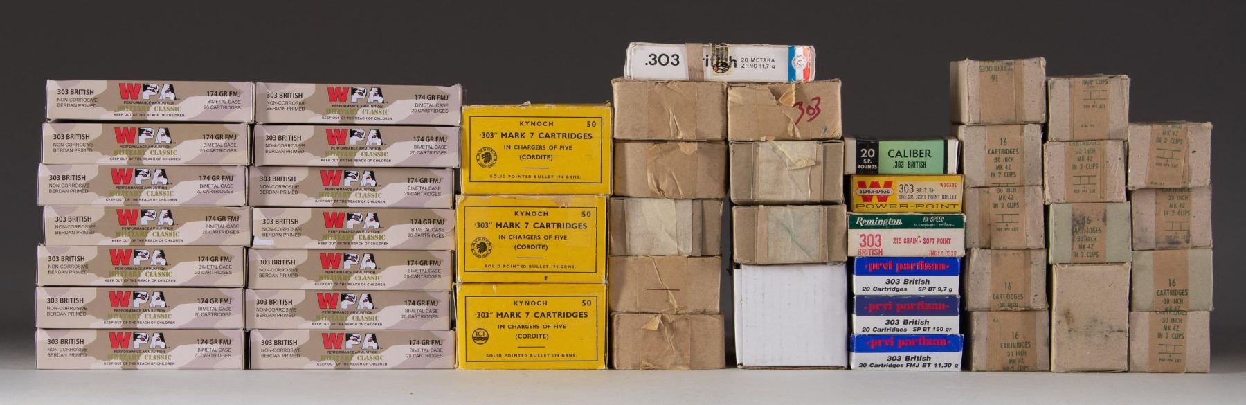 BRITISH AND 30-06 MILITARY AND SPORTING AMMUNITION. 303 British Ammo Includes: 1) KYNOCH. 3 boxes of 50 rounds each. Mk7 solid pointed bullet, 174 grains. Loaded in 5 round stripper clips. (150 total). 2) HXP Greek. 3 boxes of 48 rounds each. FMJ bullets. (144 total). 3) Canadian "C.I.A." labeled box. Four boxes of 48 rounds each, one partial box of 32 rounds w/ 31 remaining plus one partial box of approx. 30 rounds. Mk7 ball. (253 total). 4) "DZ 1943". Approx. 30 rounds packed loose. FMJ bullets. (30 total). 5) WPA "Made In Russia". 14 boxes of 20 rounds each. Bimetal case. Berdan primed. Non-corrosive. 174 grain FMJ. Contained in factory 280 round shipping box. (280 total). 6) Prvi Partizan. Two boxes of 20 rounds each. Soft point boat-tail 150 grain bullets. (40 total). 7) Prvi Partizan. One box of 20 rounds. 174 grain FMJ boat-tail. (20 total). 8) Prvi Partizan. One box of 20 rounds. 11.7 gram soft point bullets. (20 total). 9) Remington. One box of 20 rounds. 215 grain soft points. (20 total). 10) Winchester. One box of 20 rounds. 180 grain soft point. (20 total). 11) Globe Firearms. One box of 20 rounds. 150 grain soft point. (20 total). / 30-06 Ammo Includes: No.1: Pakistan Ordnance Factory. 12 sealed boxes of 16 rounds each. Boxes marked "16 CARTRIDGES 30 INCH MK4Z IN TWO CLIPS". Garand clips are for M1 Garand rifles. (192 total). CONDITION: ammunition appears generally clean & serviceable w/ small spots of oxidation. Boxes range from fair to very good & may have wear, small tears & staining. Three plastic ammunition storage boxes, plus cardboard shipping case. (02-24542-4/RW). AMMO. $400-600.