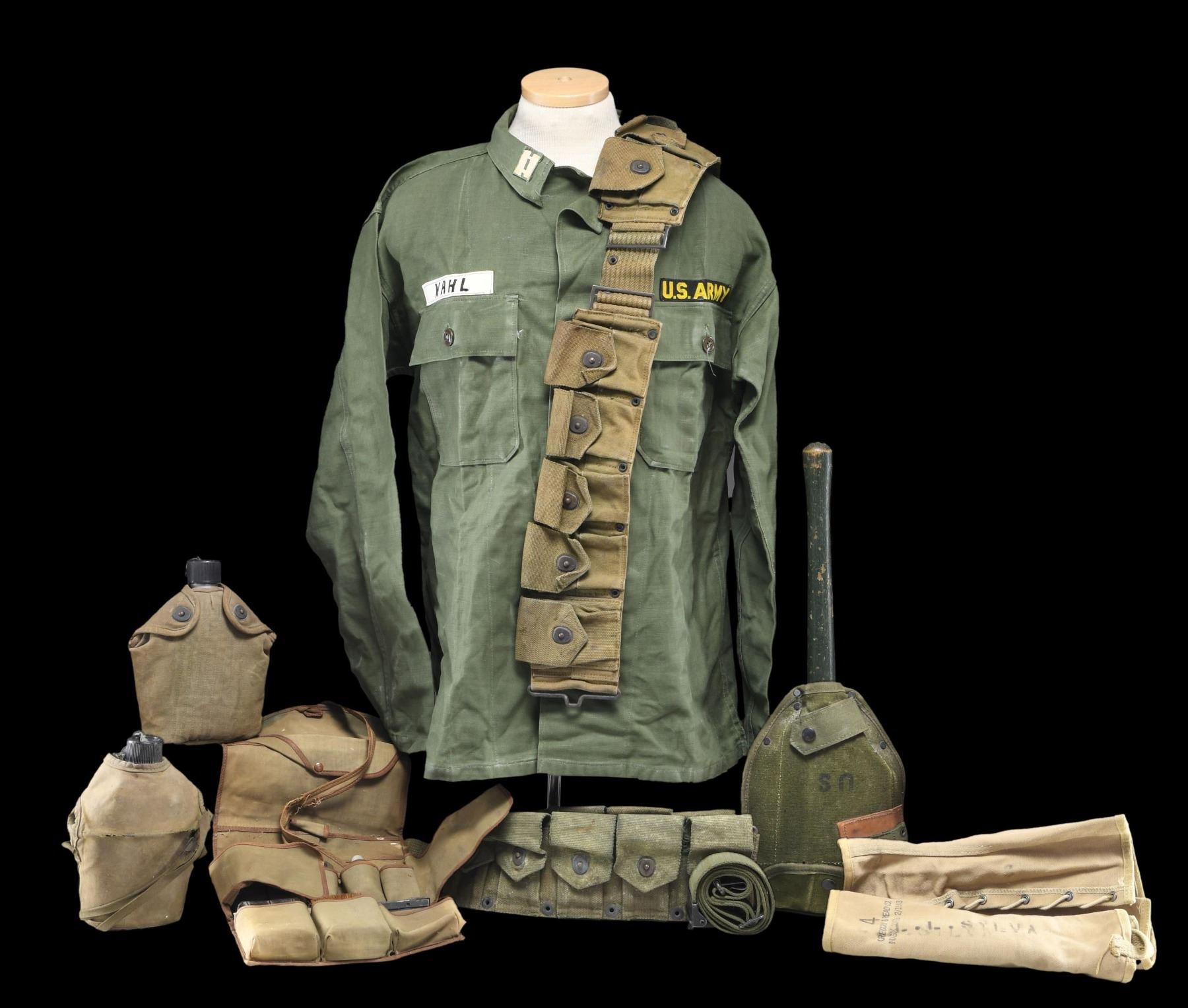 1). Folding Entrenching Tool. Marked "US / WOOD / 1945". Equipped w/ M1960 web carrier. 2) Two unmarked Model 1923 green web cartridge belts. 3) One pair of tan canvas leggings marked Gregory & Read Company & dated 2-16-43. 4) Korean War Era rifle sling. 5) One aluminum boy scout canteen w/ shoulder strap. 6) Aluminum military style canteen marked "Wesco Japan". 7) Unmarked Canvas carrier. 8) Unmarked green canvas toilet kit. Includes metal straight-razor case w/o razor. Sewing kit, soap dish & brush are included. 9) One utility jacket, size medium w/ medical insignia & USAMM shoulder patch. CONDITION: normal wear, staining & occasional small tears as would be expected from used military items. (02-24268-1/RW). NON-GUN. $200-300