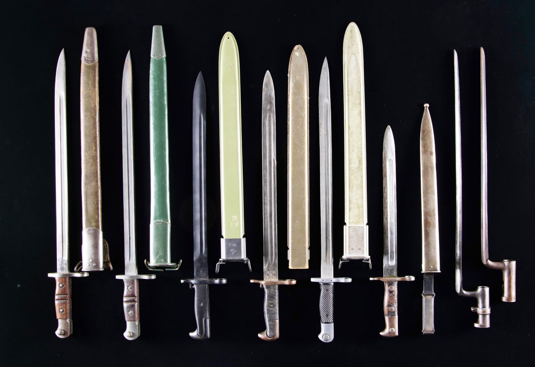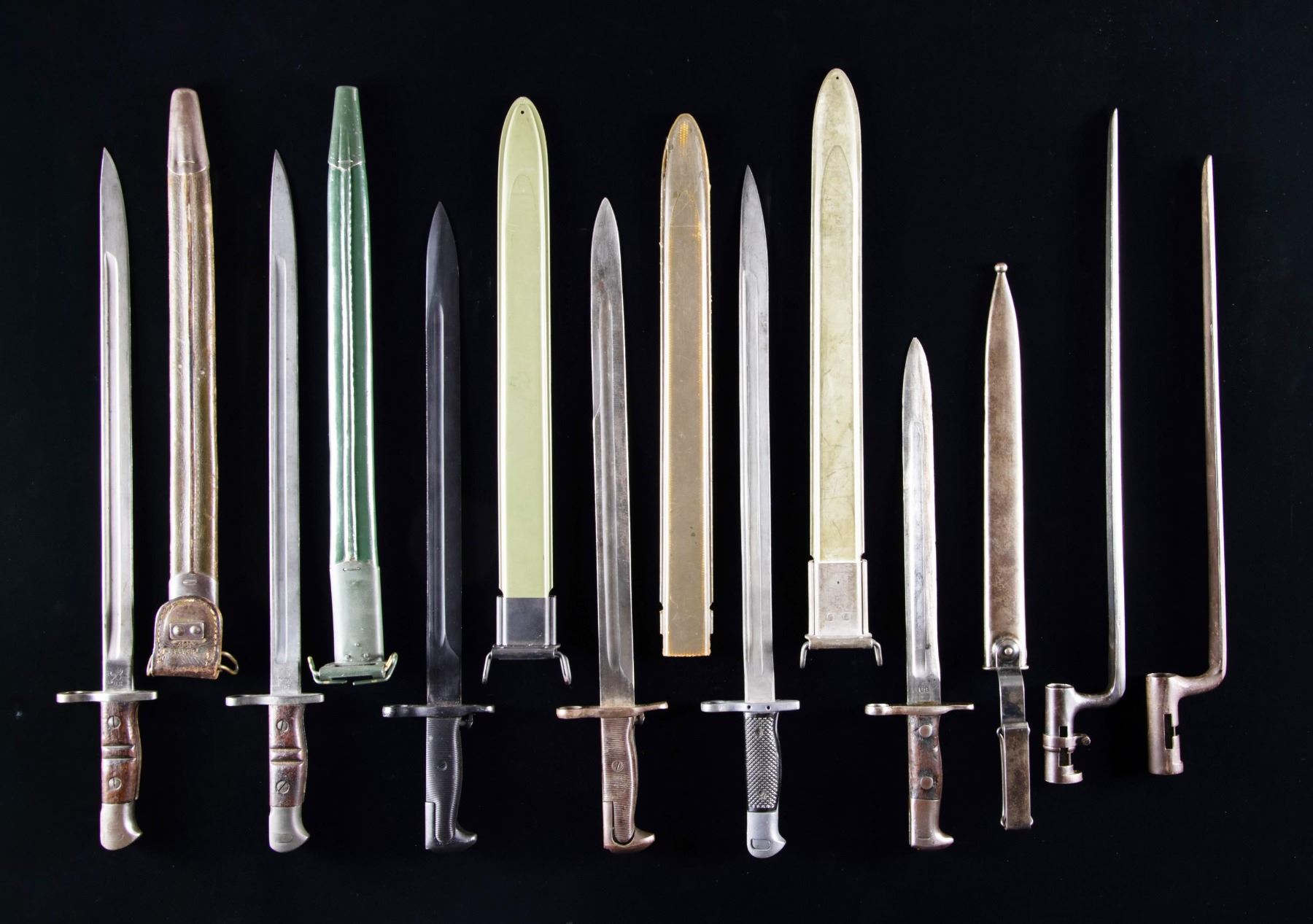 1) U.S. Model 1816 Socket Bayonet. 16" triangular blade marked "U.S." on top. Blade also has a flute extending 8 1/2" back from the point. "T" slot w/ reinforced bridge. Neck is marked on right side w/ "A". Socket marked on right side w/ "6" & small oval cartouche. CONDITION: bayonet has turned overall patina w/ moderate wear. 2) U.S. Model 1873 Socket Bayonet. 18" triangular blade. 21" overall. Bayonet is unmarked. Locking ring is present. CONDITION: bayonet retains traces of original blue turning gray & patina w/ spots of light oxidation. 3) U.S. Model 1892 Krag Bayonet. 11 1/2" bright fullered blade. 16 1/8" overall. Smooth wood grips retained by two rivets. Blade is marked on left ricasso "1896" & right ricasso "U.S.". Blued steel scabbard w/ Phelps type belt attachment. CONDITION: blade has been sharpened, having moderate wear, turning gray. Balance of metal turning gray & patina. Grips have notable wear, staining & numerous missing chips. Scabbard shows cleaning turning overall gray & patina w/ light wear. 4) Remington Model 1917 Bayonet. 17" fullered parkerized blade. 21 3/4" overall. Left ricasso marked w/ "1917 / encircled REMINGTON". Right ricasso has eagle head acceptance mark, "flaming bomb" & "U.S.". Smooth walnut grips w/ two vertical grooves. Leather scabbard w/ metal throat in tip. Equipped w/ M-1910 belt hook. Scabbard has heavy coating of green paint. CONDITION: blade & balance of metal retain a large percentage of the gray arsenal rework Parkerization w/ light wear & spots of oxidation. Grips have light wear & several tiny cracks. Scabbard appears in good serviceable condition. 5) U.S. Model 1917 Bayonet. 16 7/8" bright fullered blade. 21 3/4" overall. Blade is marked on left ricasso "1917 / encircled REMINGTON". Right ricasso marked "eagle head acceptance mark / 15 / flaming bomb / U.S.". Smooth walnut grips w/ two vertical grooves. Leather scabbard w/ metal throat & tip. Leather frog w/ 1910 belt hook riveted to back of throat. Frog is marked "JEWELL / 1917". Balance of leather has remains of its original green finish. CONDITION: blade & grip of bayonet turning gray & patina w/ moderate wear. Blade has been sharpened. Grips have light wear & staining w/ several small cracks. Original green leather scabbard has wear, scuffing & flexing. Metal parts are overall gray & patina. 6) U.S. Model 1942 Bayonet. 15 3/4" parkerized fullered blade. 20 1/2" overall. Blade is marked on left ricasso "AFH / flaming bomb / U.S. / 1942". Ribbed plastic grips. Incomplete green plastic scabbard. Scabbard is missing the throat portion. CONDITION: blade retains traces of parkerization, turning overall worn gray & patina. Balance of metal is patina. Grips are worn w/ handling marks. Crossguard is bent forward at the bottom. Scabbard is cracked & open at the tip. 7) U.S. Model 1917 Shotgun Bayonet. Manufactured in the 1960s. Produced in Canada by General Cutlery. 16 3/4" fullered parkerized blade. 21 1/2" overall. Metal at grip is a bluish ceramic-like coating. Checkered plastic grips secured by two screws. Green plastic scabbard w/ metal throat marked "U.S.-M1917 / B.A.IND.". CONDITION: blade retains a large degree of its original parkerized finish. Balance of metal retains most of its finish. Grips have light wear, but remains serviceable.8) Reproduction Model 1942 Bayonet. 15 3/4" blued fullered blade. 20 1/4" overall. Blade marked on left ricasso "OL / flaming bomb / U.S. / 1943". Ribbed plastic grips. Green plastic scabbard & belt hook. CONDITION: entire bayonet & scabbard have light wear & tiny handling marks, retaining a very good appearance. (02-24537-9/RW). NON-GUN. $700-900.