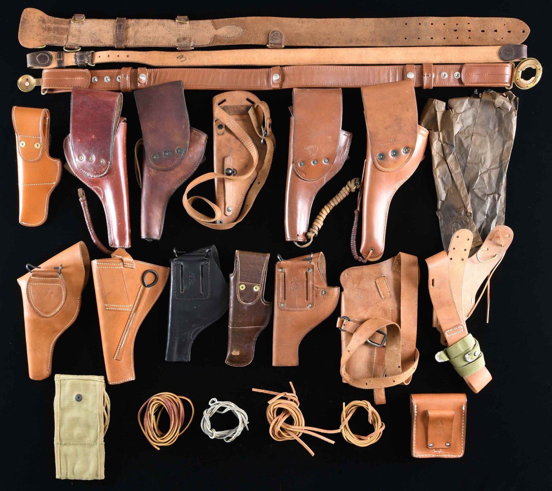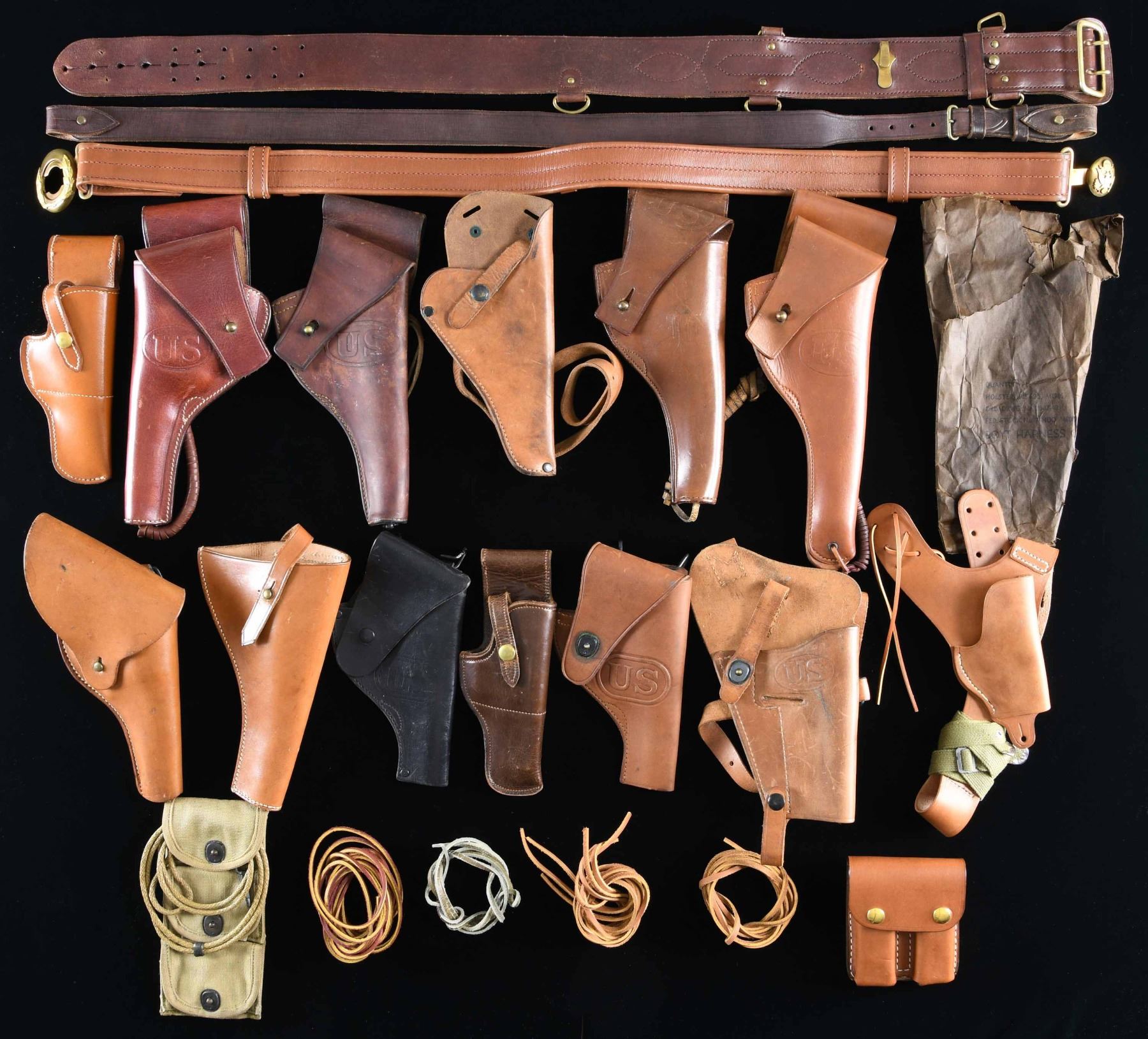 BELTS. Holsters & belts have a wide variety of colors ranging between tan & dark brown, unless otherwise noted. No.1: M2 Holster for Colt and S&W Model 1917 Revolvers. Right-handed. Holster is embossed on front "US" in oval. Marked on back "TEXTAN / 1942". Flap secured by brass stud. Holster has plug at tip. Equipped w/ a brass tie-down ring. Belt loop thong is present. No.2: M2 Holster. Right-handed. Gothic "M" has been faintly embossed on front. Flap is embossed w/ "US" in oval. Flap is secured by brass stud. Eyelets for belt loop tie-down are not present. Plug at tip has hole at bottom to attach rawhide tie-down. Tie-down is present. No.3: M4 Holster. Right-handed. Embossed on front w/ "US" in oval. Marked on back "U.S. / MILWAUKEE SADDLERY / 1944". Flap has brass stud closure. The tip has a closed end w/ an eyelet for the rawhide tie-down which is present. No.4: M2 Holster. Right-handed. Marked w/ "US" in oval on front. Otherwise unmarked. Flap secured by brass stud. Plug at tip has hole to retain rawhide thong, which is present. No.5: WWII 38 Revolver Holster. Right-handed. Embossed w/ "US" in oval on front. Flap has "LIFT THE DOT" fastener. Marked on back w/ "U.S. / 1943 / CRAIGHEAD logo". Holster has both belt loop & hook. Open tip. No.6: 38 Revolver Holster. Right-handed. Black leather holster. Embossed "US" on front. Flap is retained by snap. Marked on back "FFLD ENG / 7791495". Equipped w/ belt loop & hook. Open tip. No.7: US M3 Shoulder Holster. Embossed "US" on front. Marked on back "U.S. / BOYT". Retention strap has "LIFT THE DOT" type fastener. Shoulder strap & tie-down straps are present. No.8: Shoulder Holster for Colt Detective Special. Holster is unmarked & complete w/ rawhide lacing & green web strap. No.9: Shoulder Holster for 38 DA Revolver. Marked on back "ENGER KRESS". Soldier added marking appears "MAYU / 99 / RA / CREW 3". No.10: Unmarked Flap Holster for S&W Victory Model. Right-handed. Flap is retained by brass stud. Equipped only w/ belt hook. Open tip holster appears to be modified as stitching holes extend beyond staple. No.11: Unmarked Holster of Stitched Construction. Right-handed. Holster is likely for small frame auto. No.12: British 1954 Dated Open Top Revolver Holster. Right-handed. Retaining strap is marked "ENGLAND". Equipped w/ belt loop & accessory cleaning rod. No.13: General Officer Belt Holster & Magazine Pouch Set. Includes holster for Colt pistol. Holster is right-handed. Mag. pouch is marked "BRAUER BROS.". Belt w/ eagle buckle is unmarked. Holster w/ belt loop only. No.14: Unmarked Vintage Sam Brown Belt. Shoulder strap included. Belt is for very small waist. No.15: 3 Pocket Green Web Ammo Pouch for 1917 Revolvers. Marked "R.H. LONG / 6-18". Pouch also has period green woven revolver lanyard. No.16: Original Packaging for a M1916 Holster. Packaging is badly damaged. No.17: Small Quantity of Rawhide Lancings, Tie-Down Straps, Etc. CONDITION: except as noted, most items are in good, to very good, condition. All appear to be serviceable. Stitching is generally tight on all items. Metal parts have verdigris. (02-23715/RW). NON-GUN. $400-800.