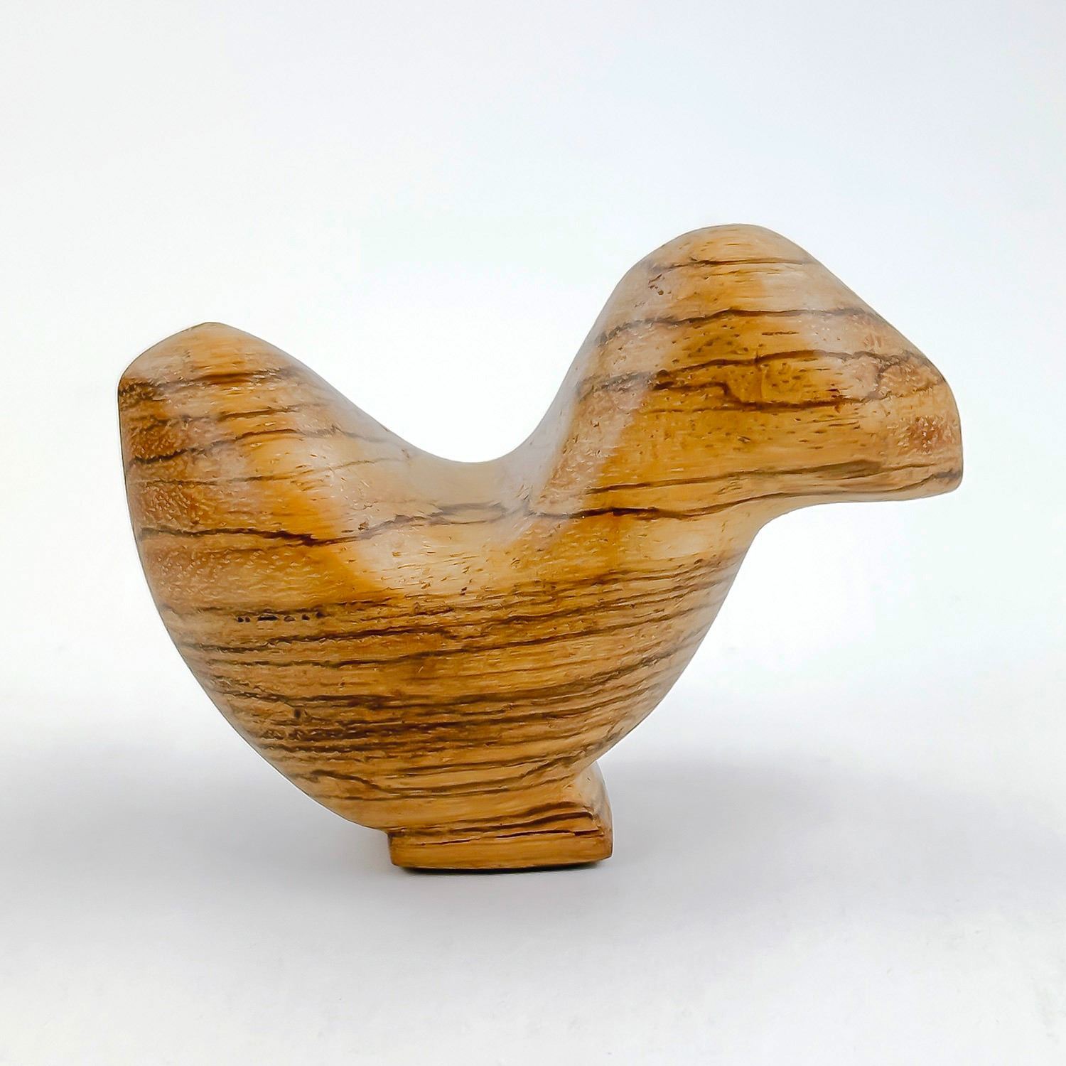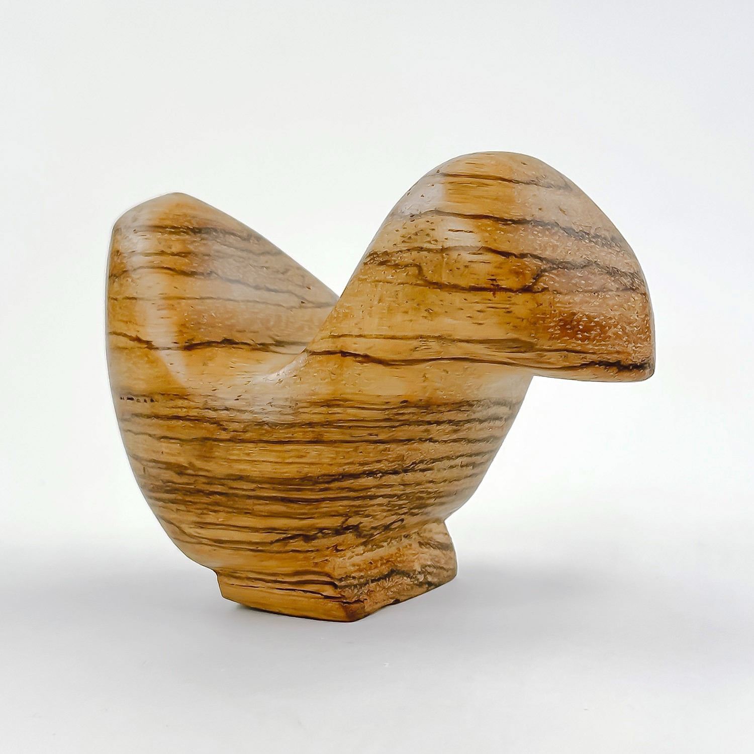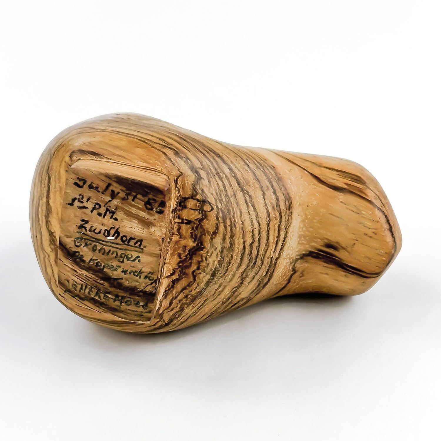 #9492 - HAND CRAFTED CARVED ABSTRACT WOODEN BIRD. SIGNED & DATED ON BASE. HARD TO READ - IT APPEARS TO READ: JULY 31, 85 - 1:21 PM - ZUIDHORN GRONINGEN. THEN MAYBE - DE KOPENICK 16 REMAKE WOOD. HOME OR OFFICE DECOR PAPERWEIGHT. MEASURES 4” (10 CM) LONG BY 2” (5 CM) WIDE AND STANDS 2.75” (7 CM) TALL