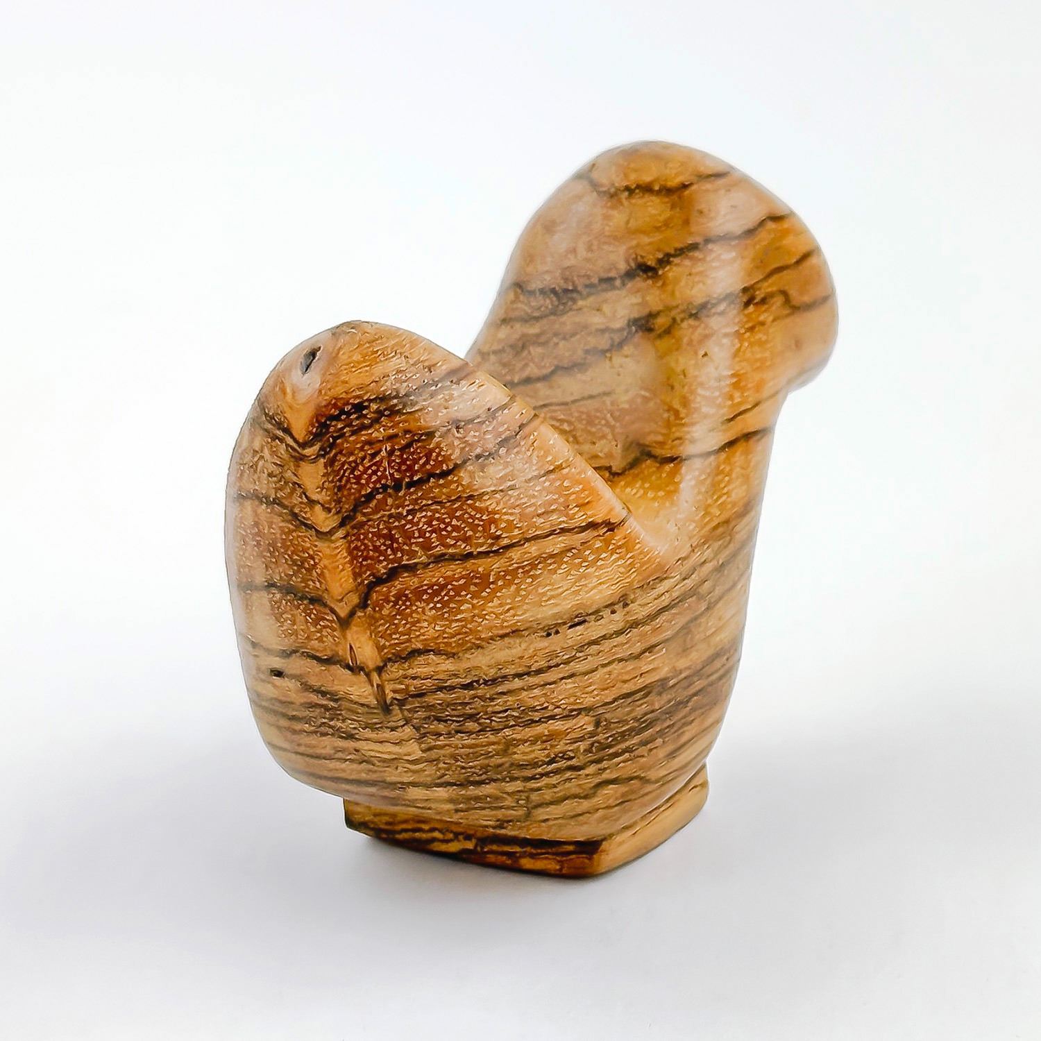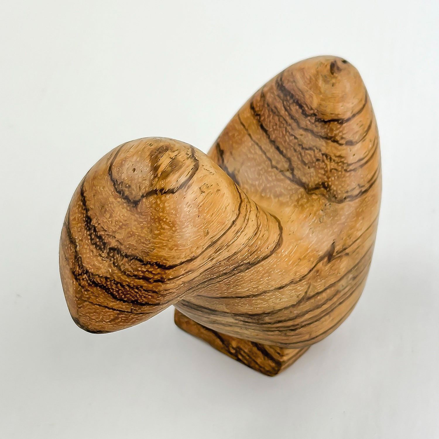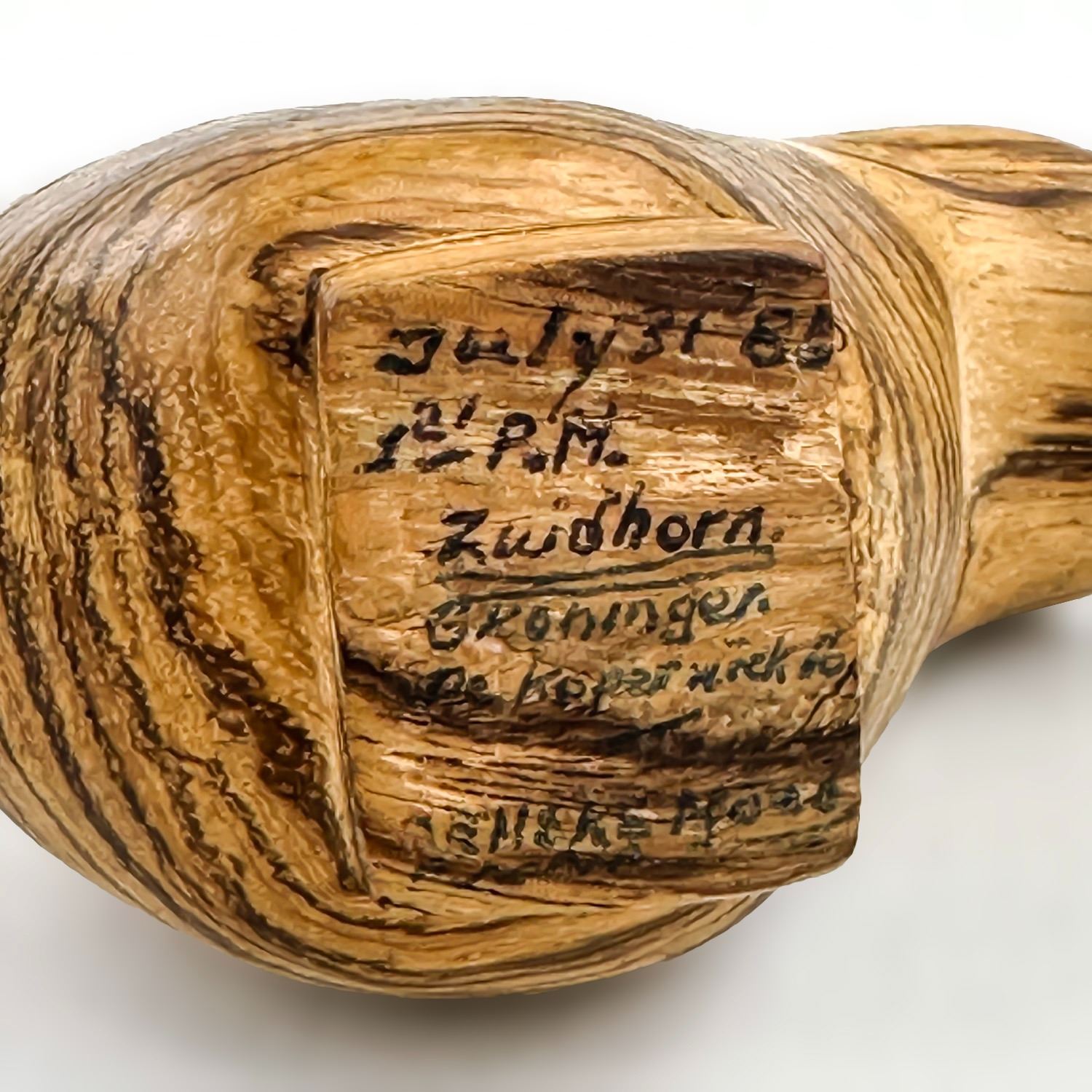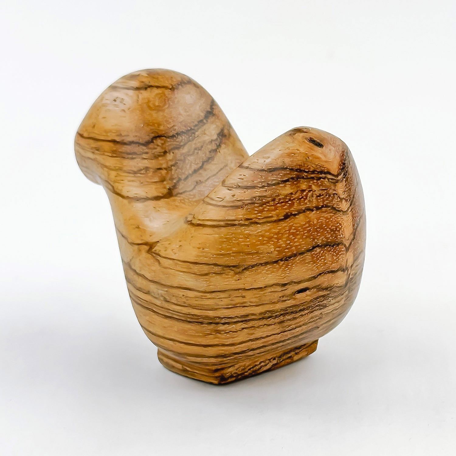 #9492 - HAND CRAFTED CARVED ABSTRACT WOODEN BIRD. SIGNED & DATED ON BASE. HARD TO READ - IT APPEARS TO READ: JULY 31, 85 - 1:21 PM - ZUIDHORN GRONINGEN. THEN MAYBE - DE KOPENICK 16 REMAKE WOOD. HOME OR OFFICE DECOR PAPERWEIGHT. MEASURES 4” (10 CM) LONG BY 2” (5 CM) WIDE AND STANDS 2.75” (7 CM) TALL