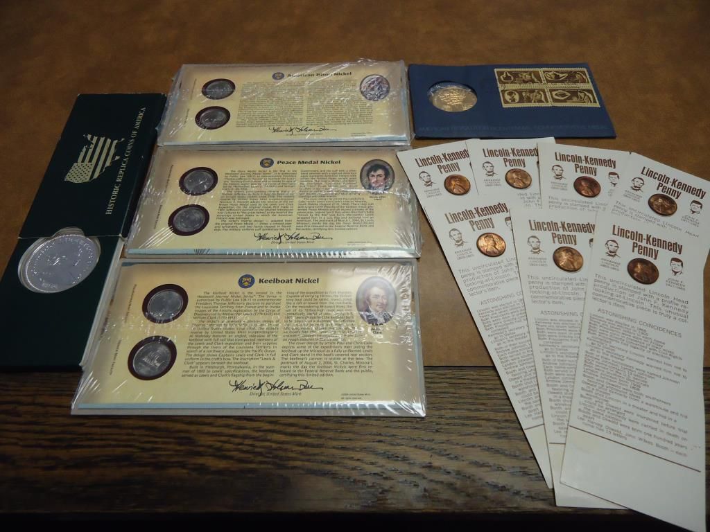 THIS LOT STARTS WITH COPY OF THE 1804 SILVER DOLLAR, 7-LINCOLN-KENNEDY PENNIES, 1972 AMERICAN REVOLUTION BICENTENNIAL COMMEMORATIVE MEDAL FDC AND 3 US MINT JEFFERSON NICKEL FDC'S (BISON, PEACE MEDAL AND KEELBOAT)