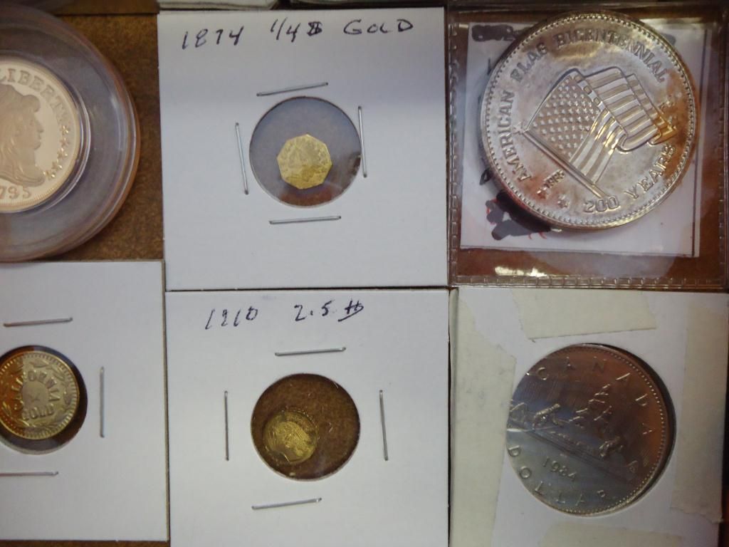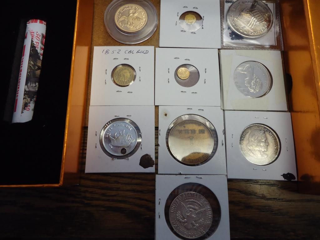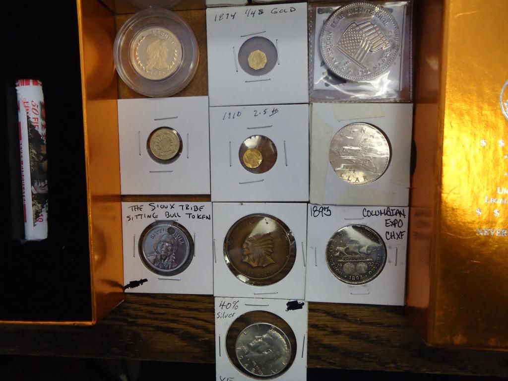 THIS LOT STARTS OUT WITH 5 BOXES OF NEVER CIRCULATED US COINS 2-HOT SPRINGS NATIONAL PARK QUARTERS, 2-LINCOLN CENTS (SHIELDS) AND ROLL OF 25 JEFFERSON NICKELS. 1795 LIBERTY GOLD PF 24KT PLATED (COPY), 1874 $1/4 CALIFORNIA GOLD COPY,