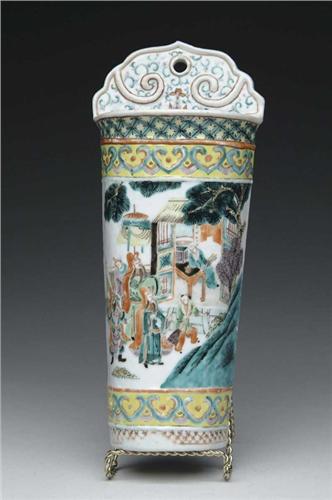 INTERESTING TAPERED DEMILUNE ORIENTAL WALL POCKET. Scene having figures, building and trees. Decorative yellow top and bottom border. SIZE: 11” h x 4-1/2” at widest. CONDITION: Very good. 9-27596