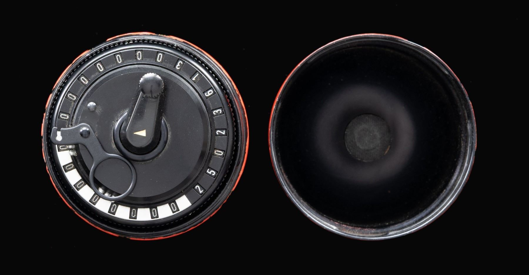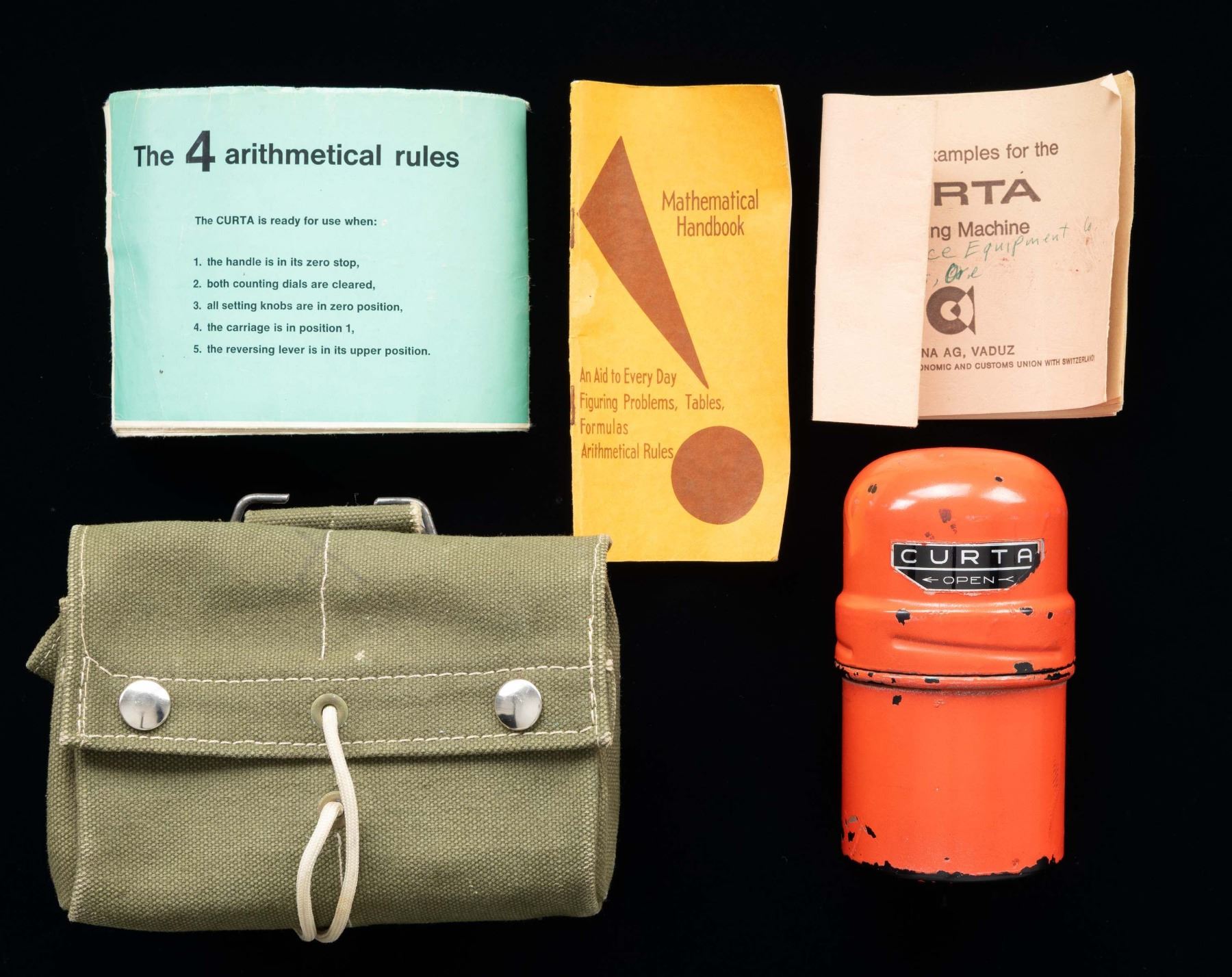 Bottom marked "Type II / No. 531151 / Made in Liechtenstein / (Customs Union with Switzerland) / by Contina Ltd Mauren / System Curt Herzstark". Included is a folding instruction sheet & two booklets. The instructions appear to be very complete in showing the use of the machine. Machine has orange painted fitted metal case & is carried on the belt in a green web pouch. The idea of a pocket calculator was conceived by Curt Herzstark in the 1930’s however, having a Jewish father and Catholic mother, Curt was taken by the Nazis and was sent to the Buchenwald concentration camp. Curt informed the soldiers at the camp of his idea and was allowed to proceed in developing the calculator which would be given to the Fuher as a present after "we win the war". Curt was assured that this would make him a Aryan. For Curt, this meant survival if he could create his idea. After the Soviet military arrived Curt fled to Austria and began his search for financial backing wherein he met Franz Joseph II who was the Price of Liechtenstein. Franz showed significant interest and formed the Contina AG Mauren company which began production. An estimate 140,000 Curta calculators were produced, (80,000 Type I and $60,000 Type II, such as this example). A remarkable invention that was highly sought after until the development of electronic calculators in the 1970’s. CONDITION: Calculator appears to be in good, serviceable condition. Case has some paint chipping. (02-24268-2/KAT). NON-GUN. $300-500.