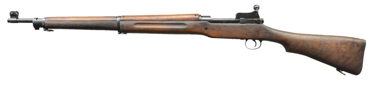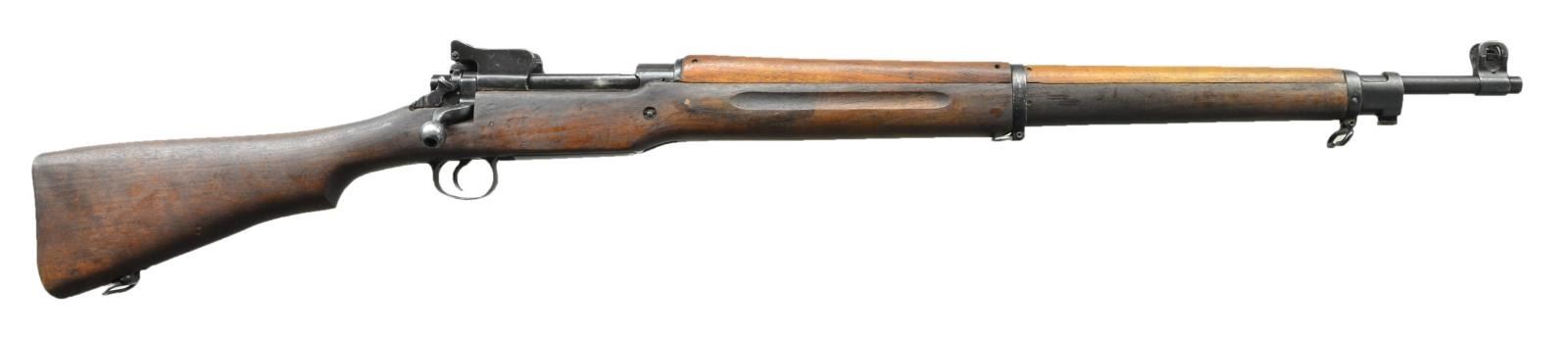 Cal. 30-06. S #445939. 26" Bbl. w/ import mark. This rifle appears to be a Commonwealth reworked example likely Indian. Top of receiver has standard Winchester markings w/ a small circled "I". bbl., front sight & bolt are correctly of Winchester manufacture but the other parts are of mixed manufacture. The floorplate is numbered matching to the receiver by S #. Ladder rear sight graduated to 1600yds. Protected blade front sight. Bottom of stock has sling swivels. Walnut Eddystone manufacture stock. CONDITION: arsenal reworked stock set shows the expected handling marks & dings. Metal shows a fading gray parkerized finish w/ some moderate pitting on floorplate, silvering on the exposed edges and oxidation on buttplate. Fair bore showing scattered frosting & light pitting. (22-2621/MJC). CURIO. $500-700.