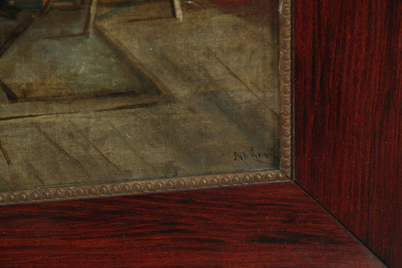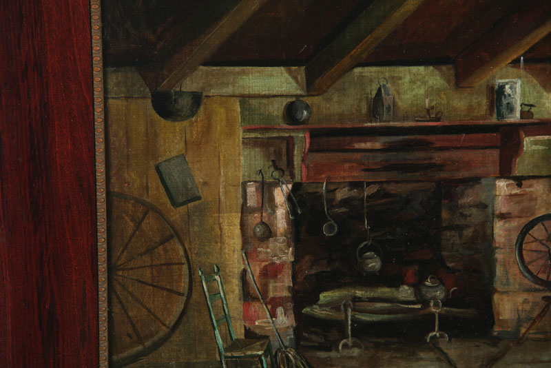 Oil on canvas, illegible signature lower right. Dimly lit colonial style setting depicting spinning wheels and pots and pans surrounding a fireplace. Possibly signed M. Quinn. 16"h. 18"w., in a frame, 22 1/4"h. 24 1/4"w.