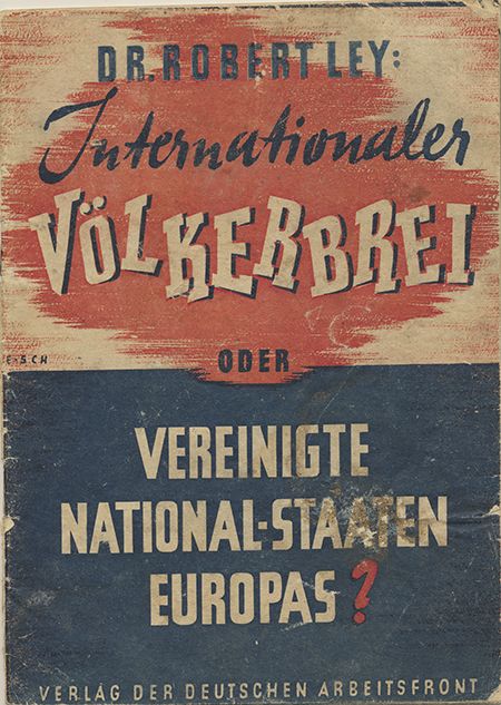 ROBERT LEY (1890-1945) Nazi politician, virulent anti-Semite, and head of the German Labor Front. Ley ruthlessly enforced slave labor policies, and committed suicide in his jail cell at Nuremburg while awaiting trial. His booklet International Race Melange or United National States of Europe, published by the German Labor Front, Berlin 1941, 32pp., 8vo., extensively illustrated with black-and-white photographs, typical pseudo-science describing the contamination of the "Nordic" race through infiltration by "international Jewry". Covers loose, front cover soiled, else quite good.