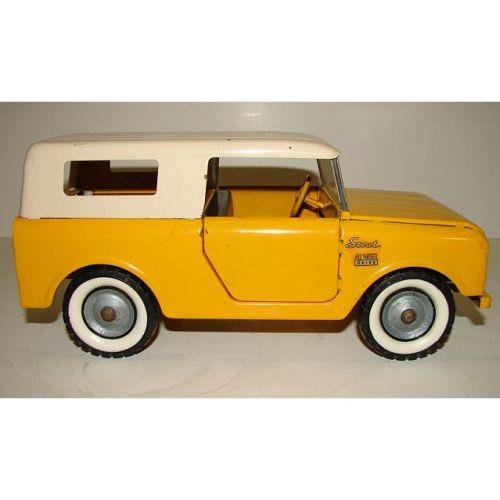 INTERNATIONAL SCOUT ALL WHEEL DRIVE TOY JEEP. Yellow and white painted. Shows excellent paint with only a few minor scratches. Marked on bottom “Made in U.S.A.” 9.5” L