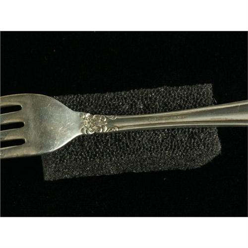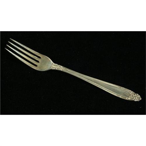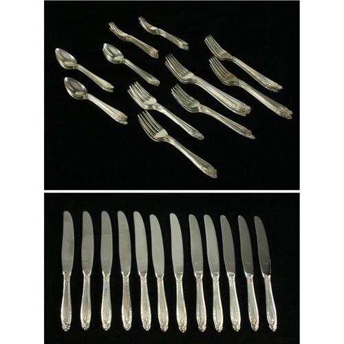 STERLING: A sterling silver flatware set by International Silver, pattern ''Prelude'', first, made in 193 and understood to be still in production. The set consists of 12 dinner knives 8.75'' HL, 12 dinner forks 7.25'', 12 salad forks 6.25'', 12 lemon forks 4 .75'', 12 5 O'clock teaspoons 5.25'', 12 round cream soup spoon 6.75'', 12 breakfast or berry spoons, solid 5.25'', 12 ice tea spoons 7.25'', 12 flat handle butter spreaders 5.25'', 1 flat handle butter spreader 6'', 1 cake server narrow SS blade10'', 1 cake server oval shaped 9.25'', 1 salad server fork and spoon 8.25'', 1 casserole server 8'', 1 pierced 3 tine serving spoon 8.25'', 1 gravy ladle 6'', and 1 oval shaped sugar spoon 5.25'', includes cloth bags, 1 per setting, 125.3 ozT. Note: overall condition is good, minor surface wear due to usage.