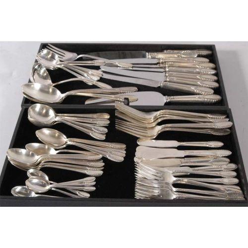 INTERNATIONAL "TROUSSEAU" PARTIAL STERLING FLATWARE SET 76 pieces, with AK monogram Consisting of: 8 demitasse spoons (4 1/4"), 14 teaspoons (6"), 8 soup spoons (5 11/16"), 8 salad forks (6 1/2"), 8 butter knives (5 3/4"), 8 forks (7 7/8"), 1 caker server (10"), 8 knives (9 1/2"), 8 ice cream spoons (5 1/2"), 1 ladle (6 1/4"), 3 serving spoons (8 1/2"), and 1 serving fork (7 3/4"). PACKING AND SHIPPING: We offer packing (double boxed in most cases) and shipping of this item within the Continental United States by USPS or UPS (our choice- boxes over 30lbs or oversized may be recalculated based on buyer's location), NOT INCLUDING INSURANCE (it will be added when we know the sales price) for $40