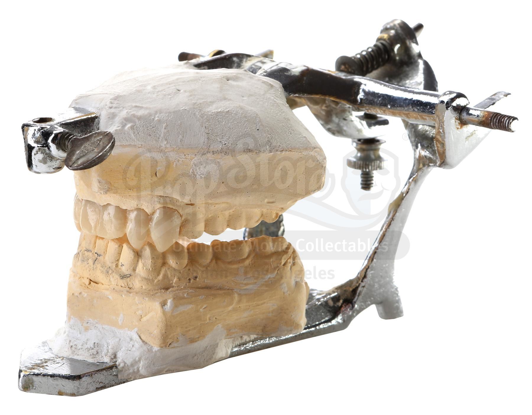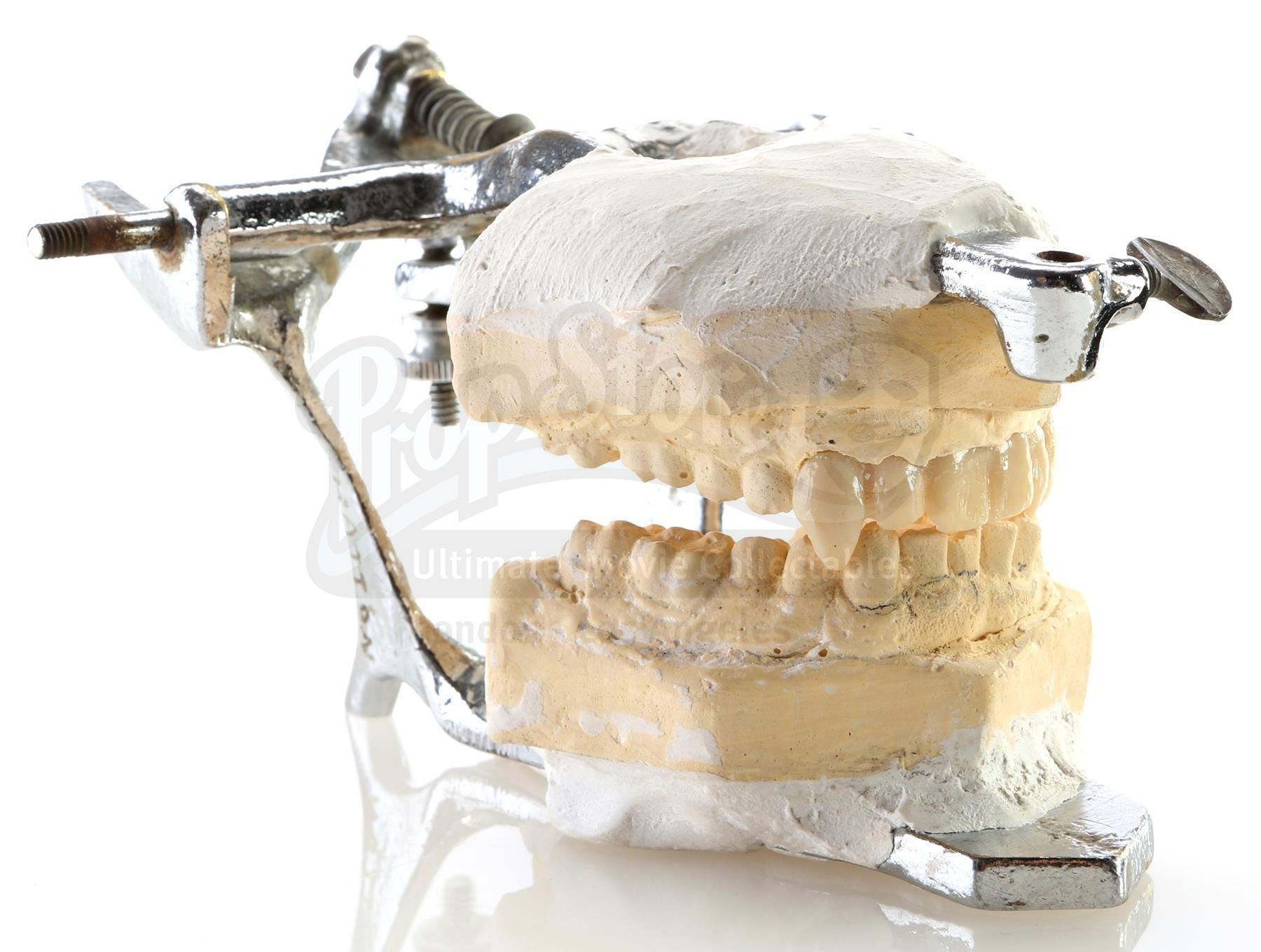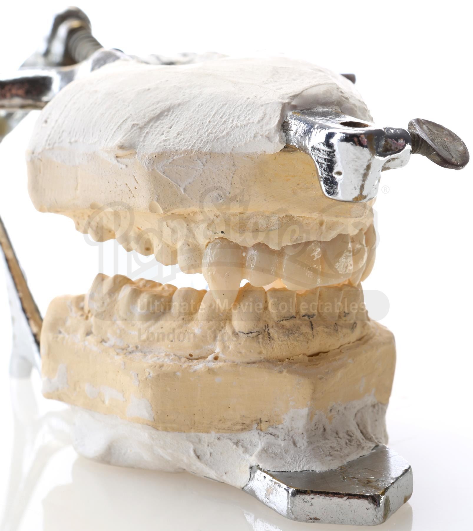 These six yellow resin upper prosthetic fangs, believed to be the only remaining set of Lestat's fangs, were constructed from a cast of Cruise's teeth by dental technician Gary Archer, and set into a plaster denture casting, which is affixed to a steel clamp for display. The plaster exhibits signs of use, including blue stains on the lower casting. This lot includes a letter of authenticity. Dimensions: 16 cm x 14 cm x 8.5 cm (6 1/4" x 5 1/2" x 3 1/4")