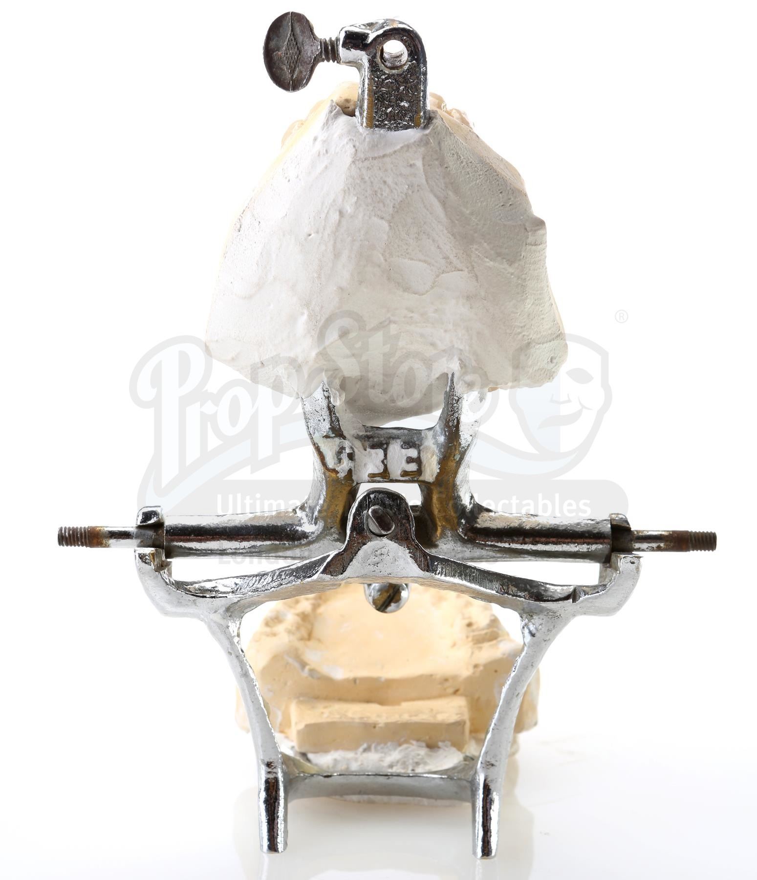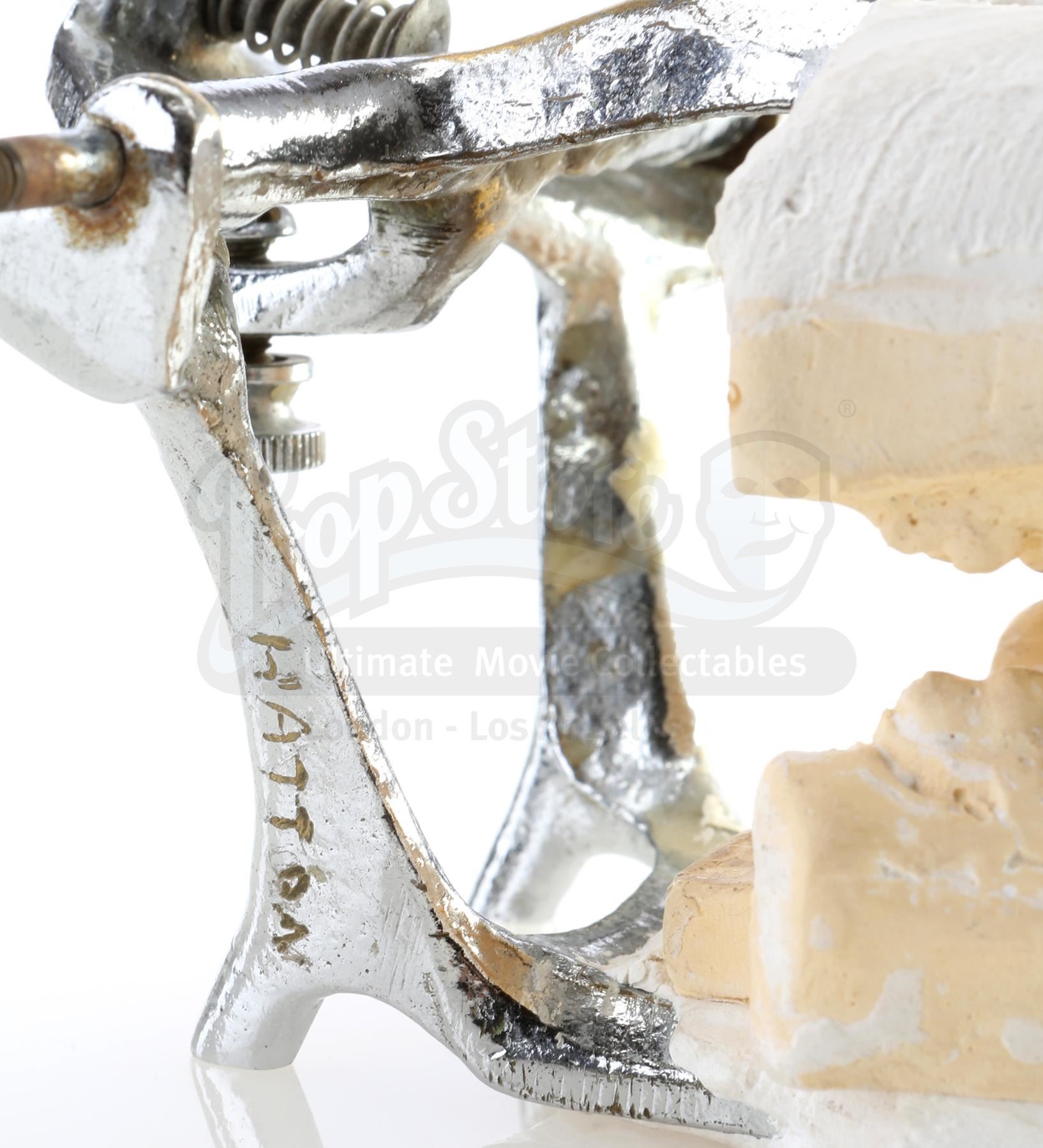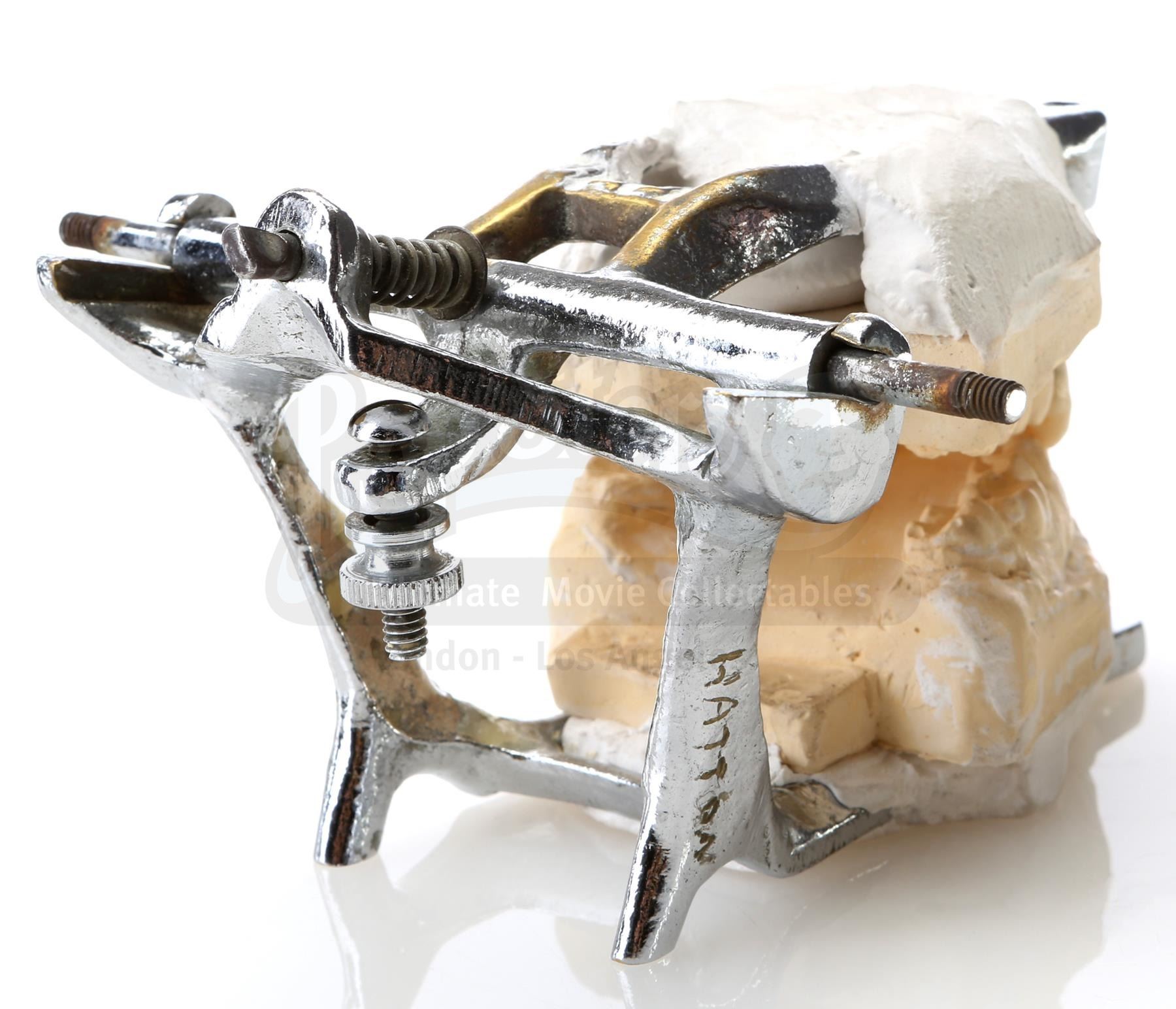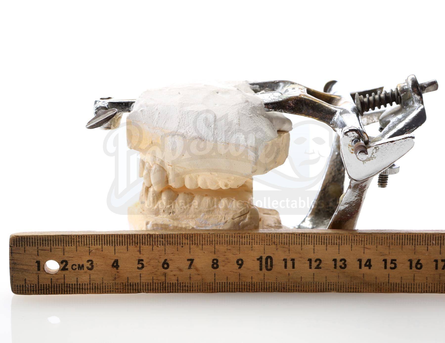 These six yellow resin upper prosthetic fangs, believed to be the only remaining set of Lestat's fangs, were constructed from a cast of Cruise's teeth by dental technician Gary Archer, and set into a plaster denture casting, which is affixed to a steel clamp for display. The plaster exhibits signs of use, including blue stains on the lower casting. This lot includes a letter of authenticity. Dimensions: 16 cm x 14 cm x 8.5 cm (6 1/4" x 5 1/2" x 3 1/4")
