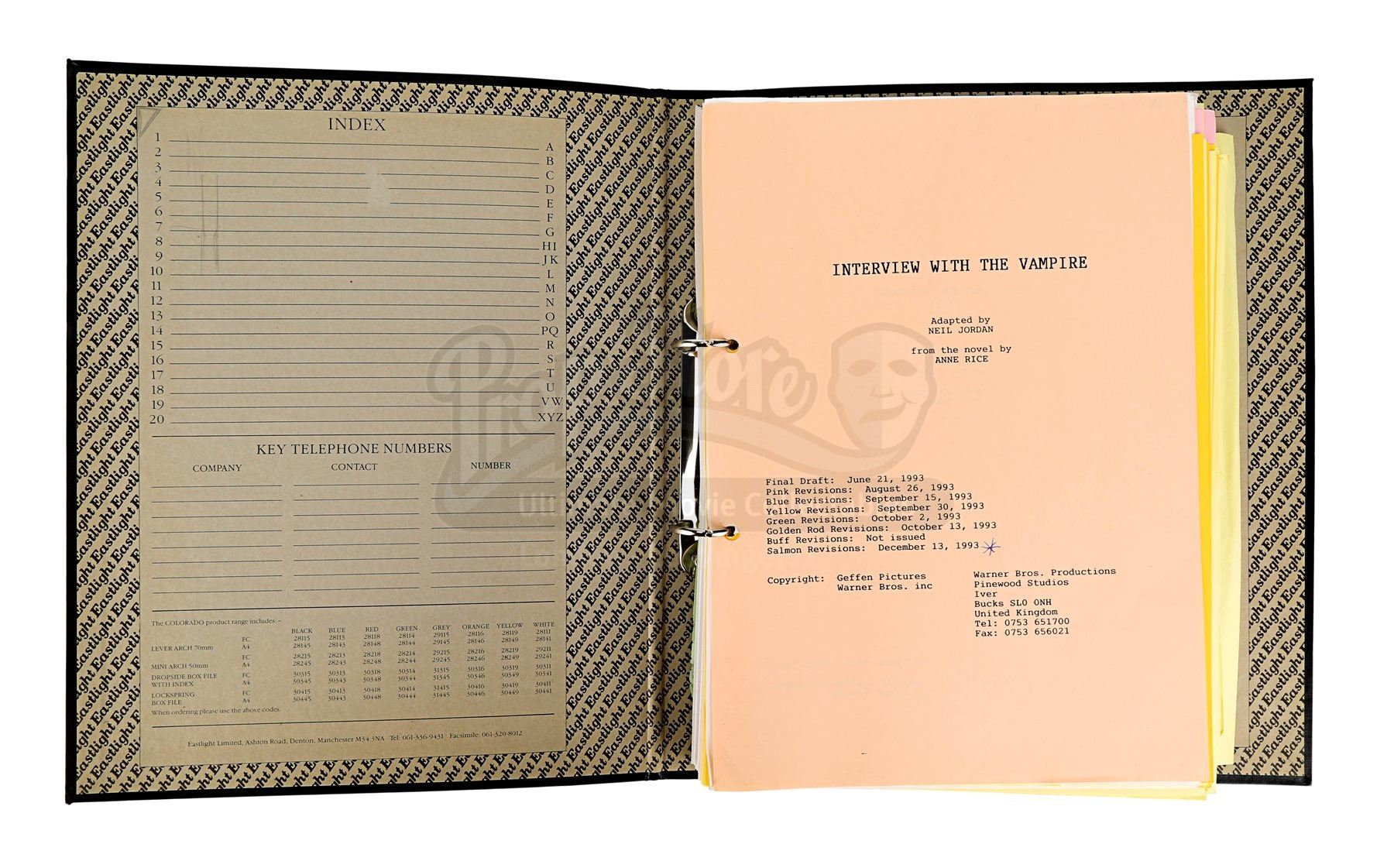 A production-used script from Neil Jordan’s horror drama Interview with the Vampire: The Vampire Chronicles. Housed in a black binder, the script displays four cover pages crediting Anne Rice (screenplay) and Neil Jordan (director), along with dates which correspond with revisions contained within.